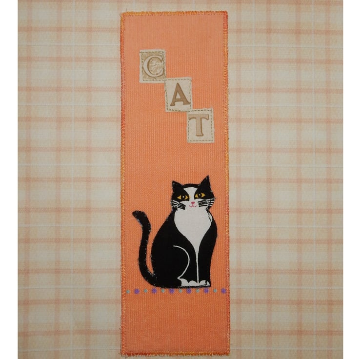 This bookmark features a cute black and white cat with the addition of the word "CAT" appliqued on. It measures 2.5 x 8 inches and is made from velvet effect fabric with the cat appliqued on. The edge is stitched in variegated thread and it has a plain cream fabric on the reverse and a layer of stiffening for a quality feel.