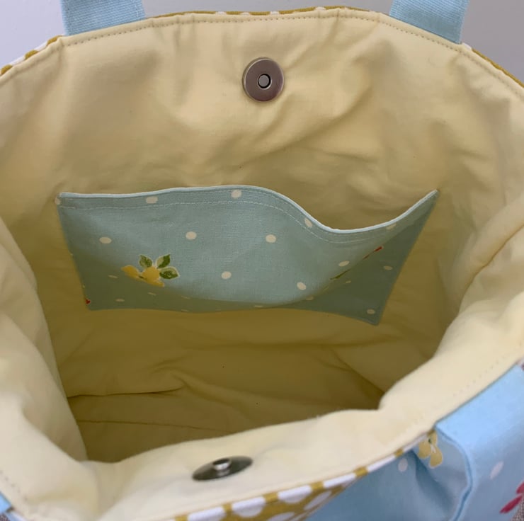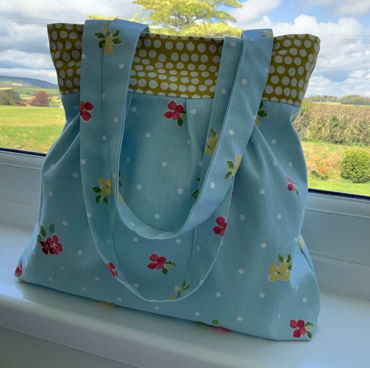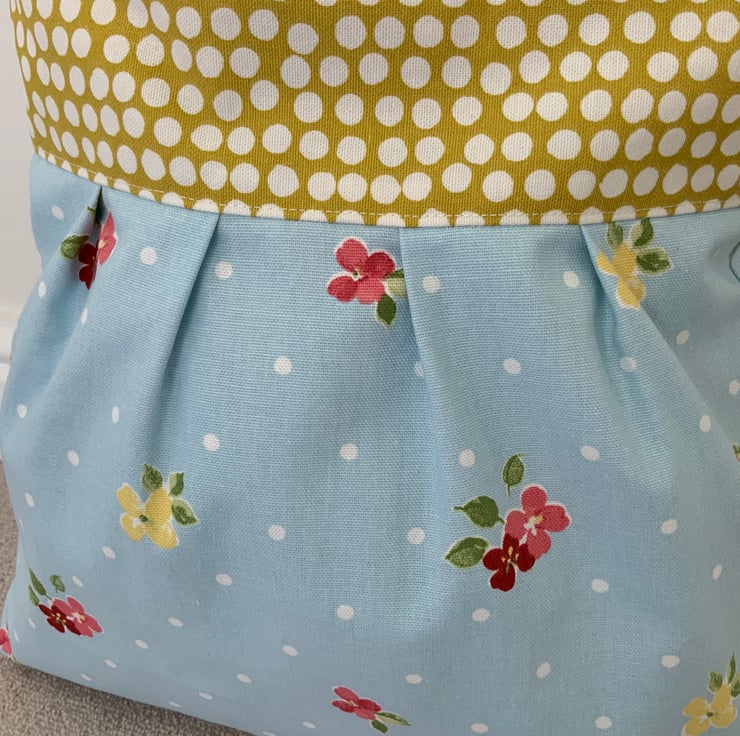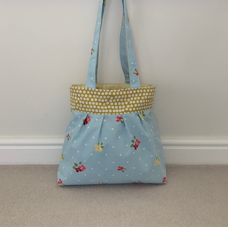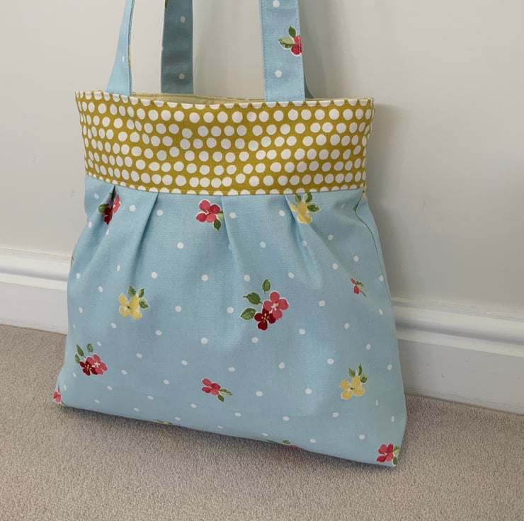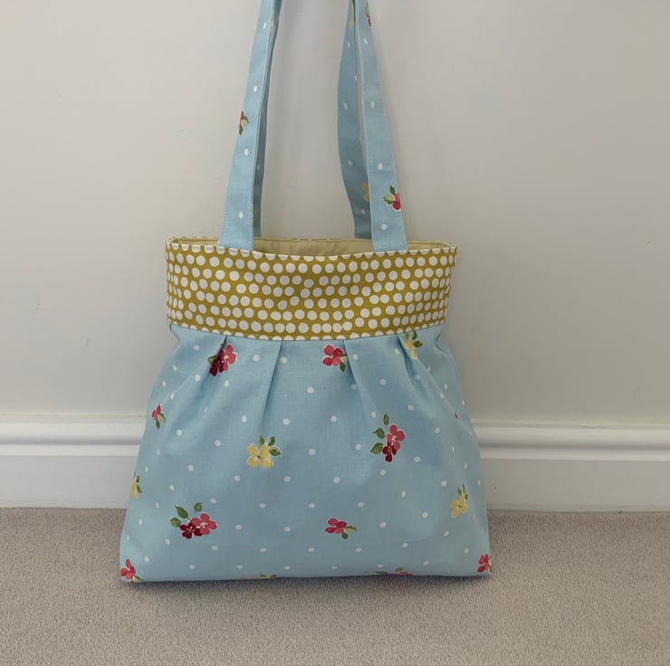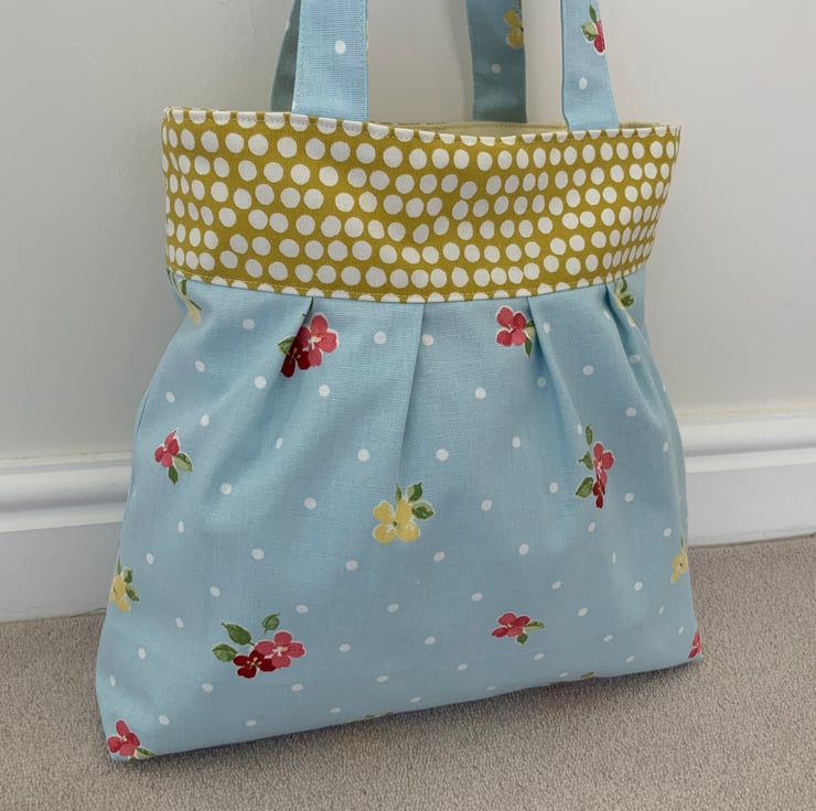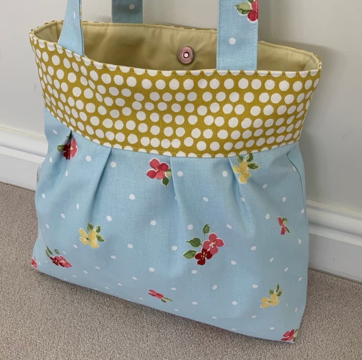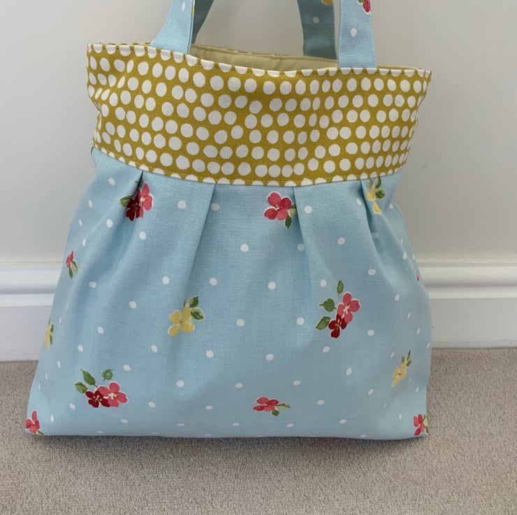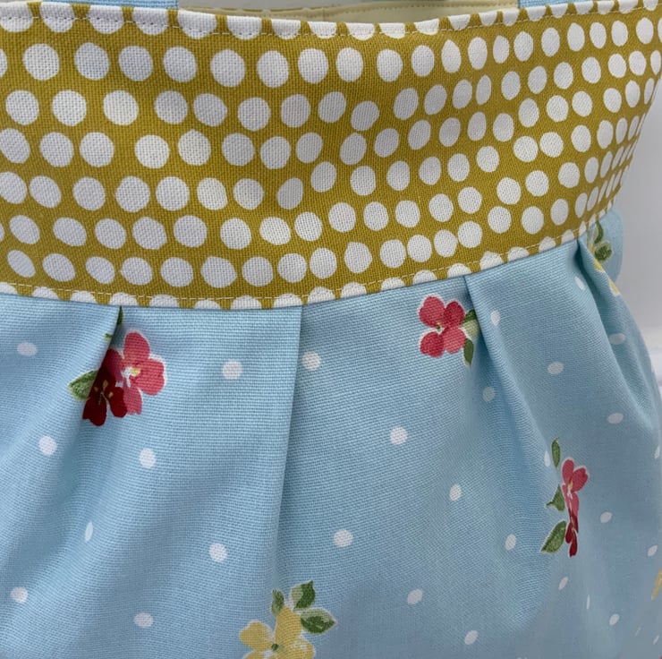 Beautiful pleated tote bag. Ochre coloured band at top with a pleated floral fabric beneath. Lined with lemon cotton with a layer of interlining sandwiched in between to give it structure and a soft luxurious feel. Internally, it has a small slip pocket and is fitted with a magnetic snap fastener. The square bottom gives the bag extra depth.