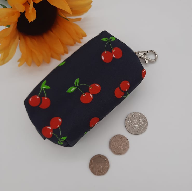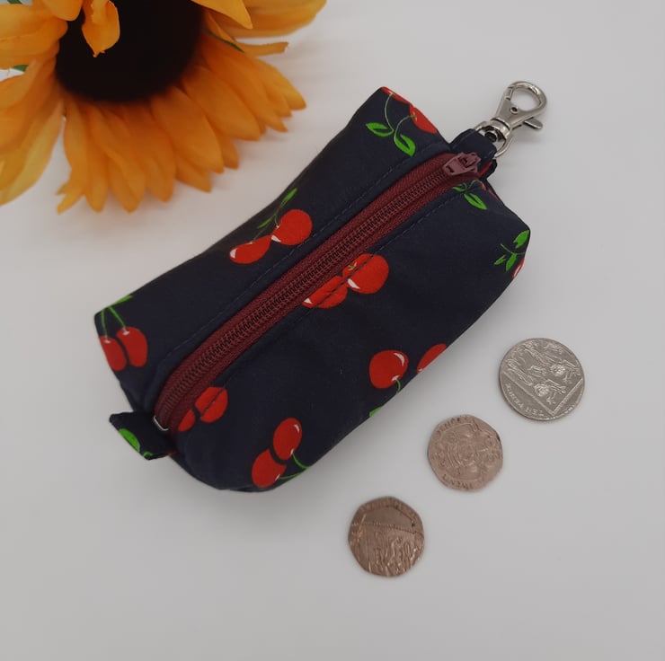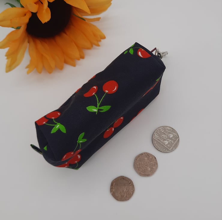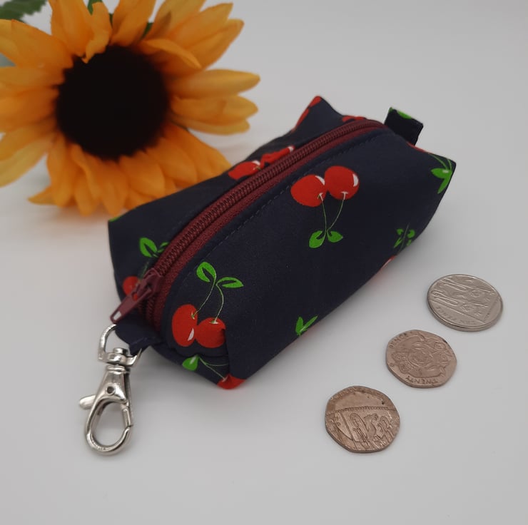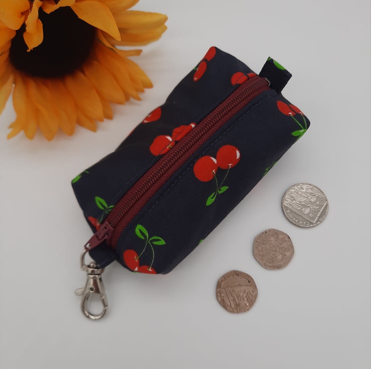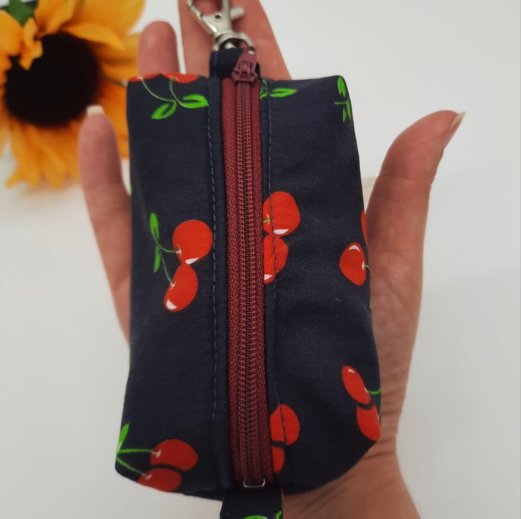Made from a navy blue cherry print cotton fabric, self lined with a zip fastening.