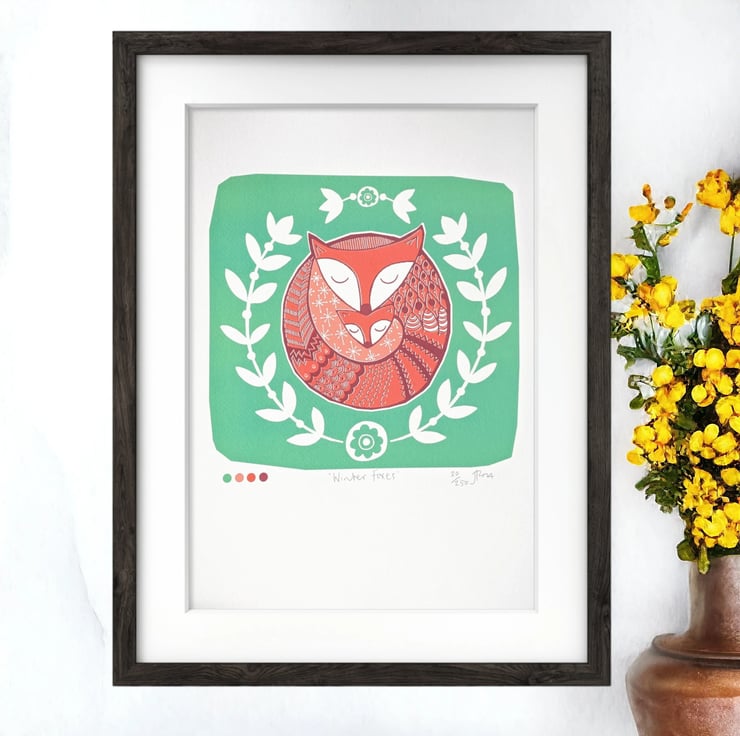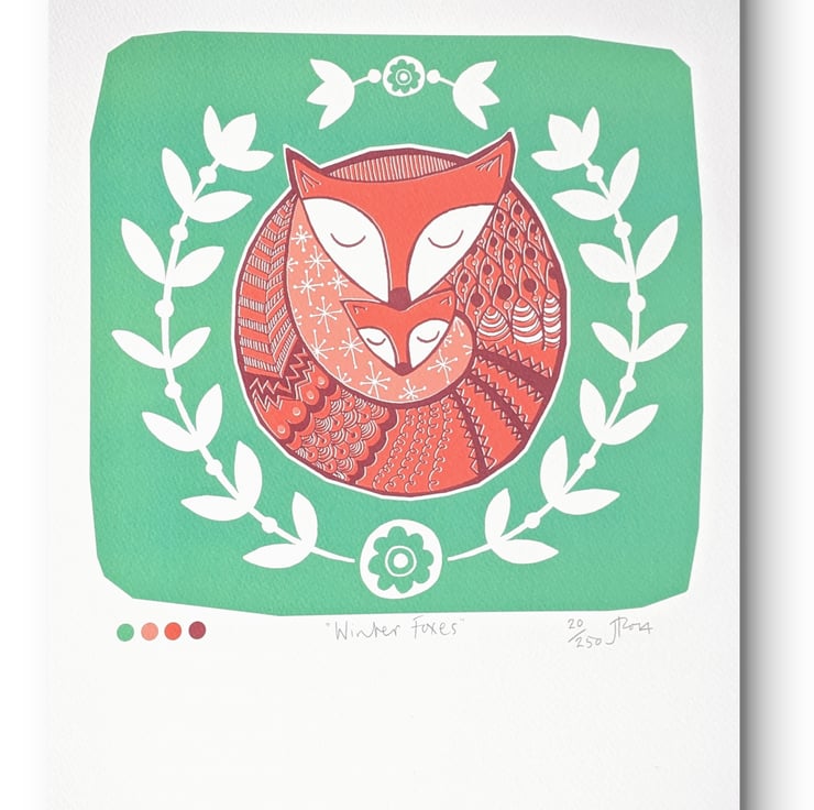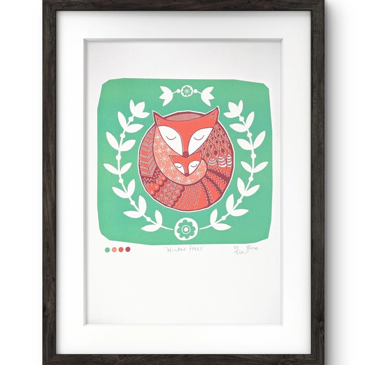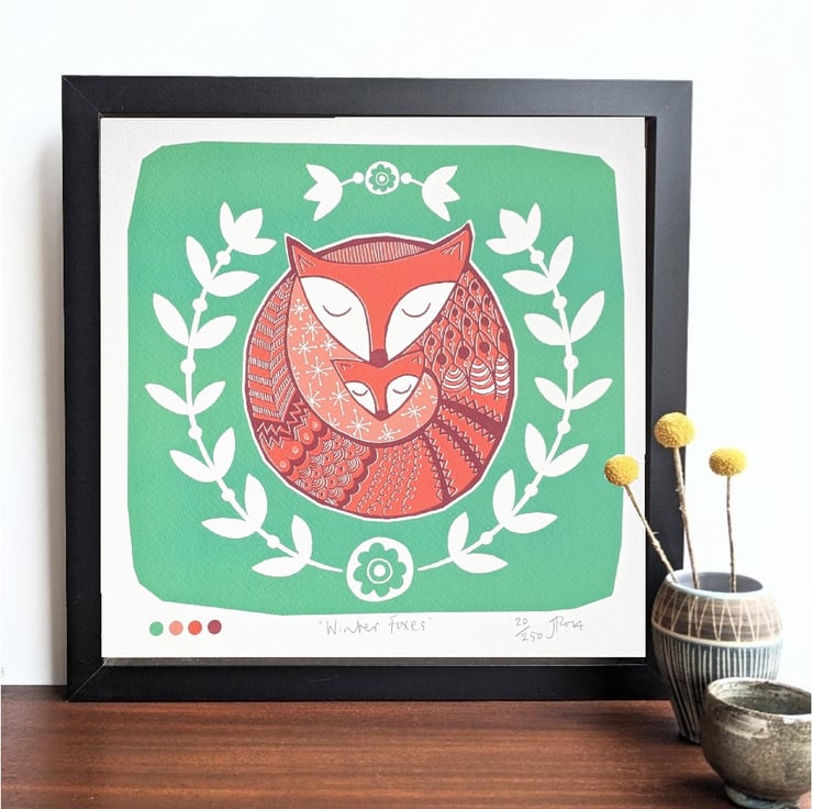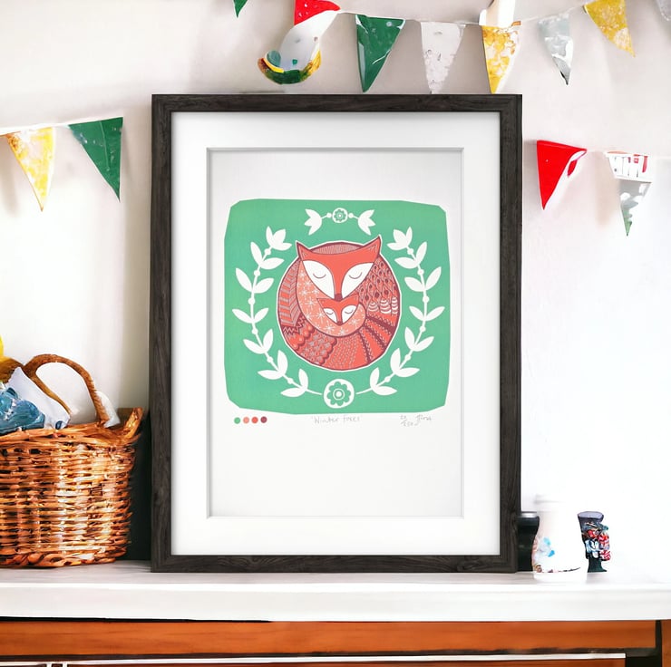A lovely pair of foxes snuggling down for a snooze. This digital print is taken from a hand-drawn design of mine and printed onto lovely thick textured paper. Perfect for a nursery or child's room!