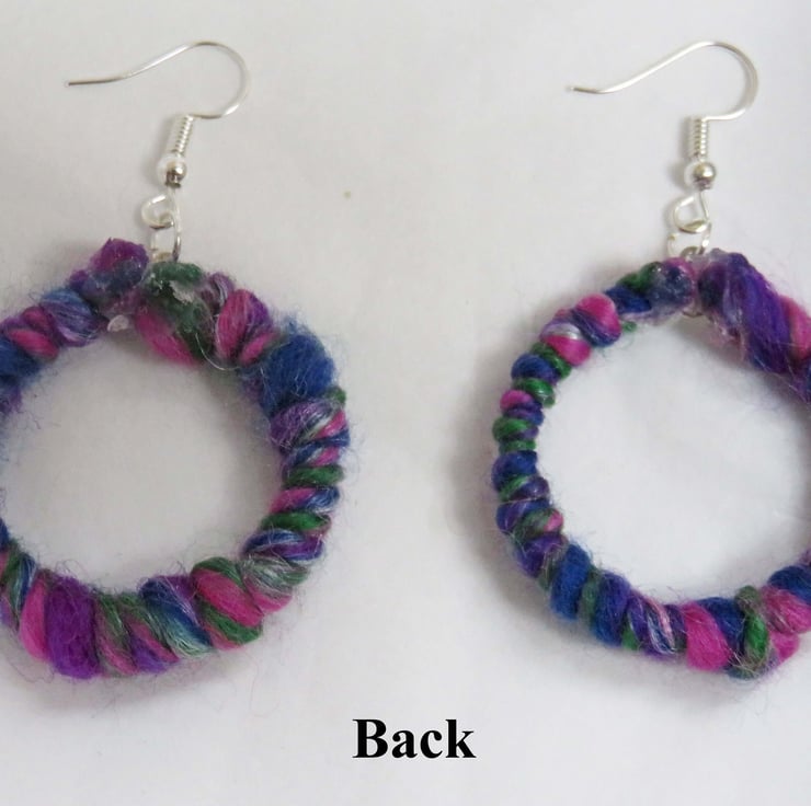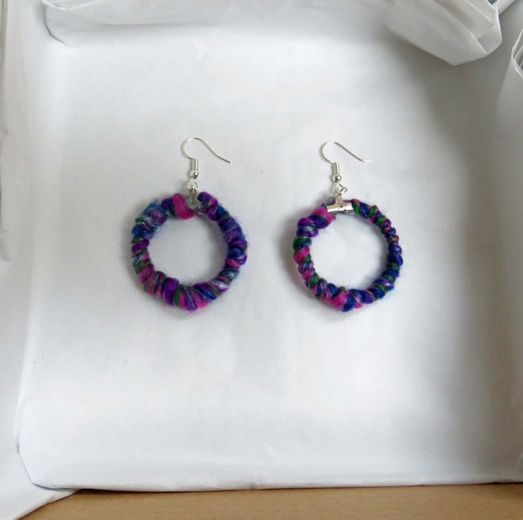 These hand finished earrings have been wrapped in hand spun yarn. The yarn itself is eco-friendly because it is made from natural waste fibres wools and some silk sold by a shop, I then spin and ply it myself. Because of this the yarn is unique and even two lengths taken one after the other will be different, which is why even pairs are not exactly identical.