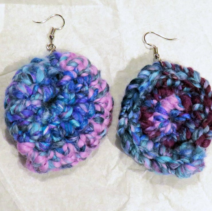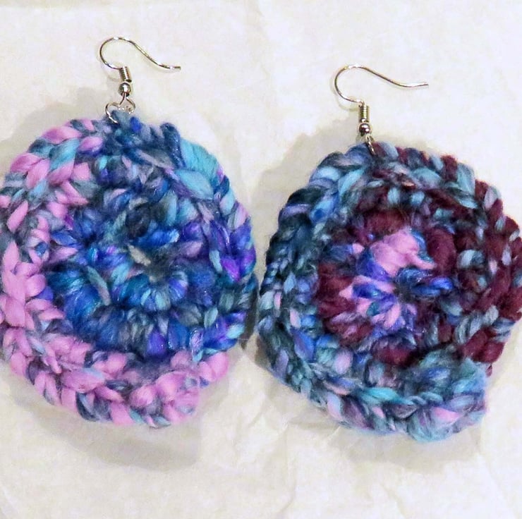These earrings have been handmade from waste fibres from a shop, which I have then spun and plied into a yarn, I then crocheted the yarn into circles and attached the earring hooks. This means that all of these earrings are unique and cannot be recreated exactly.
