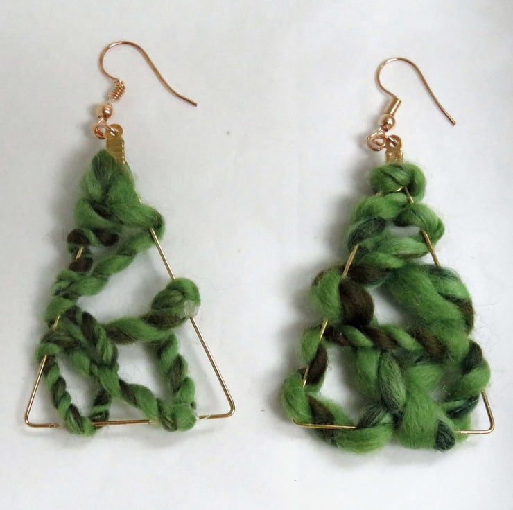 These hand finished earrings have been wrapped in hand spun yarn. The yarn itself is eco-friendly because it is made from natural waste fibres wools and some silk sold by a shop, I then spin and ply it myself. Because of this the yarn is unique and even two lengths taken one after the other will be different, which is why even pairs are not exactly identical.