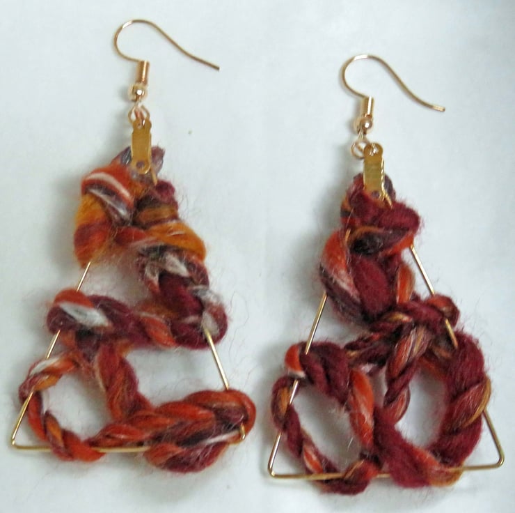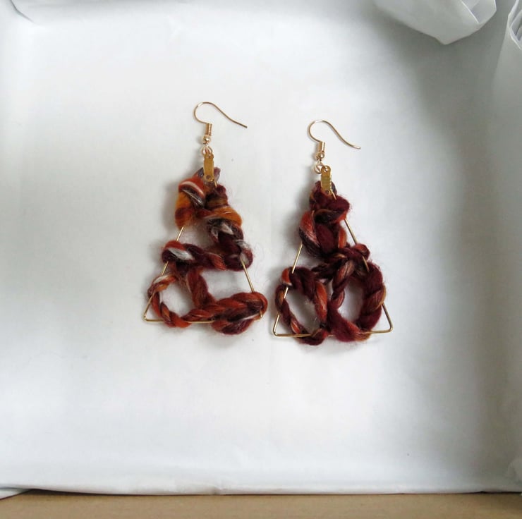 These hand finished earrings have been wrapped in hand spun yarn. The yarn itself is eco-friendly because it is made from natural waste fibres wools and some silk sold by a shop, I then spin and ply it myself. Because of this the yarn is unique and even two lengths taken one after the other will be different, which is why even pairs are not exactly identical.