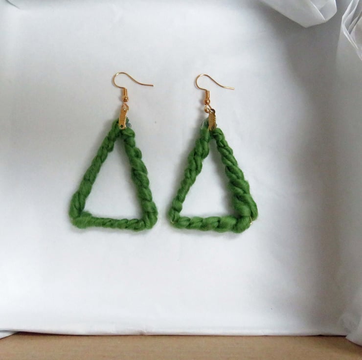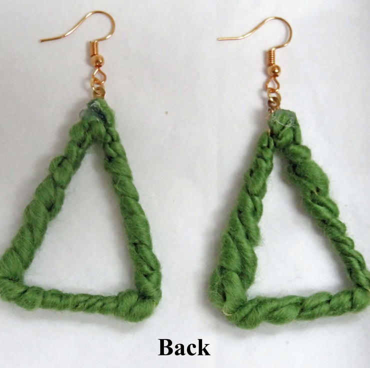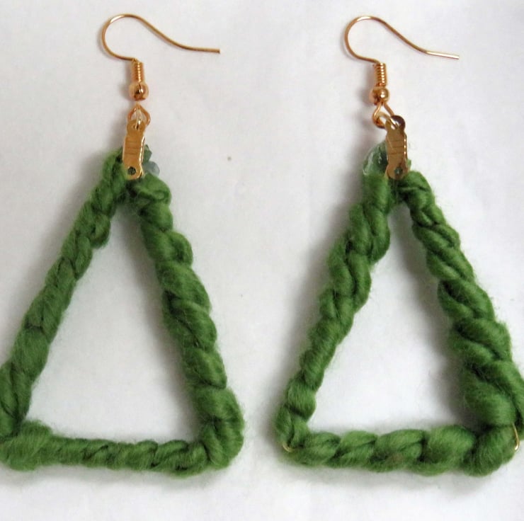 These hand finished earrings have been wrapped in hand spun yarn. The yarn itself is eco-friendly because it is made from natural waste fibres wools and some silk sold by a shop, I then spin and ply it myself. Because of this the yarn is unique and even two lengths taken one after the other will be different, which is why even pairs are not exactly identical.