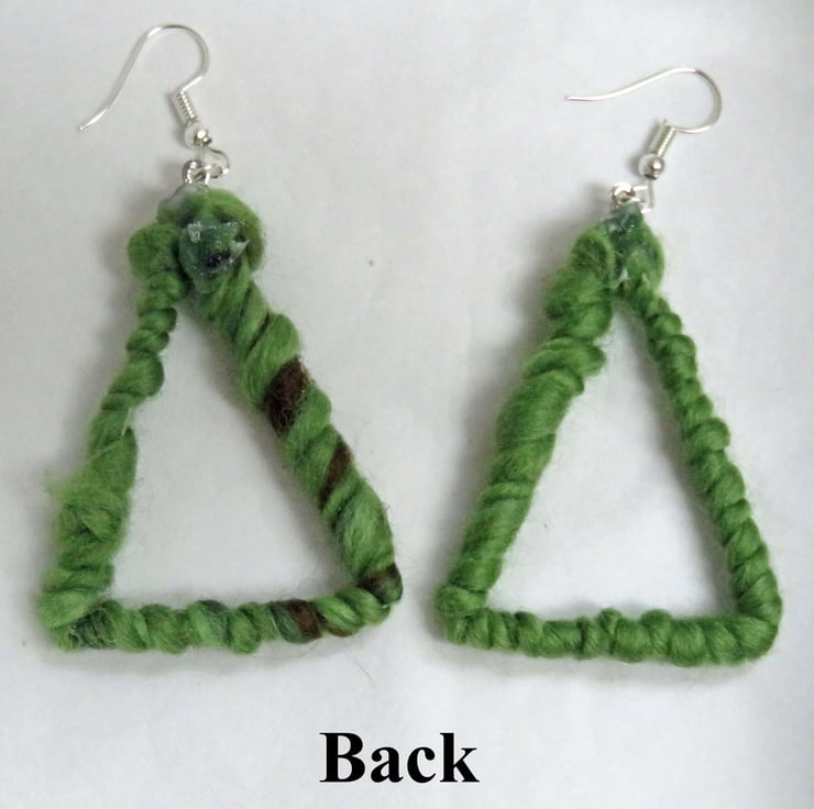 These hand finished earrings have been wrapped in hand spun yarn. The yarn itself is eco-friendly because it is made from natural waste fibres wools and some silk sold by a shop, I then spin and ply it myself. Because of this the yarn is unique and even two lengths taken one after the other will be different, which is why even pairs are not exactly identical.