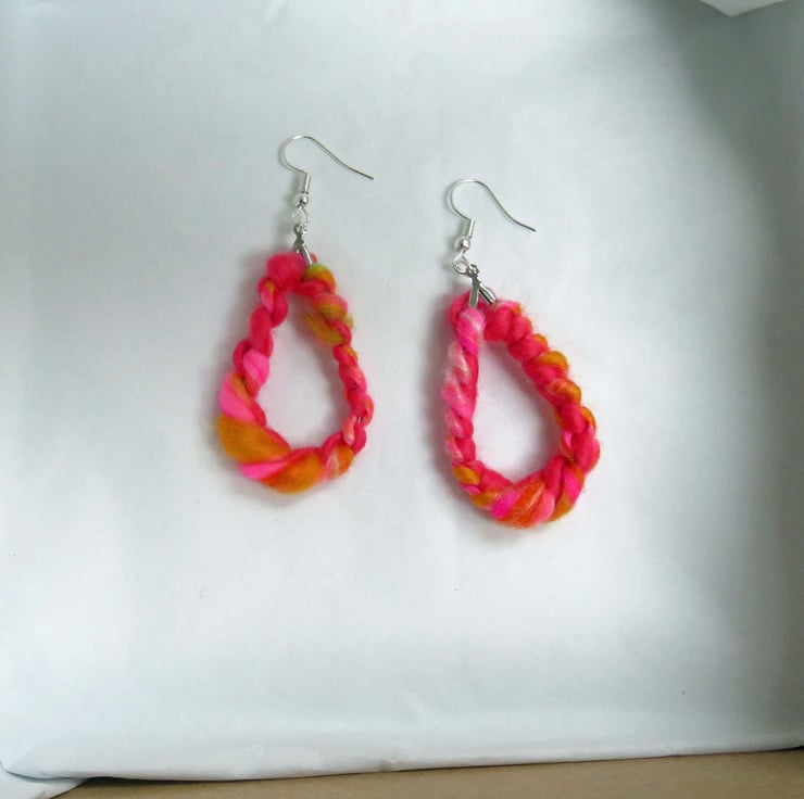 These hand finished earrings have been wrapped in hand spun yarn. The yarn itself is eco-friendly because it is made from natural waste fibres wools and some silk sold by a shop, I then spin and ply it myself. Because of this the yarn is unique and even two lengths taken one after the other will be different, which is why even pairs are not exactly identical.