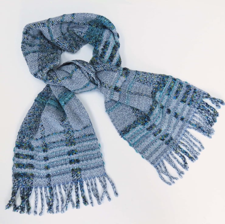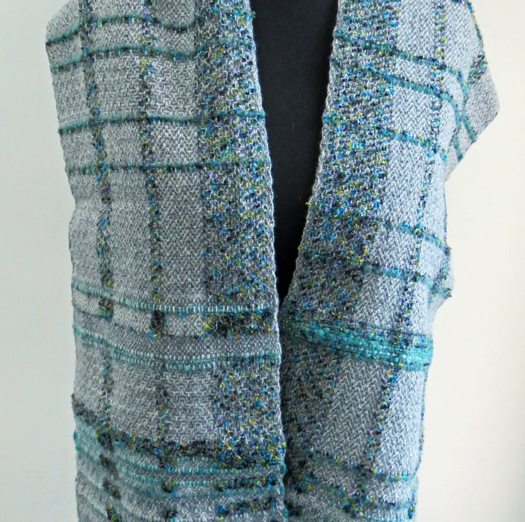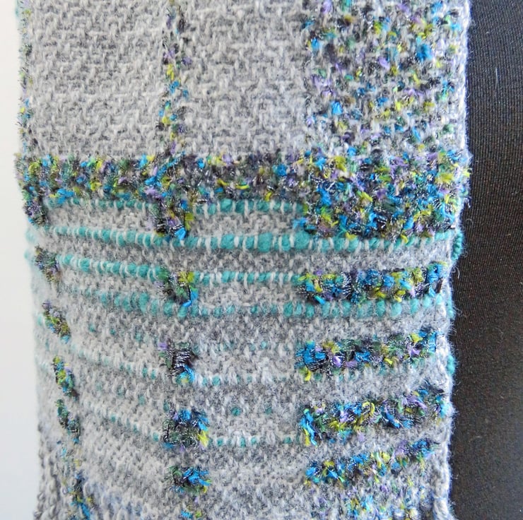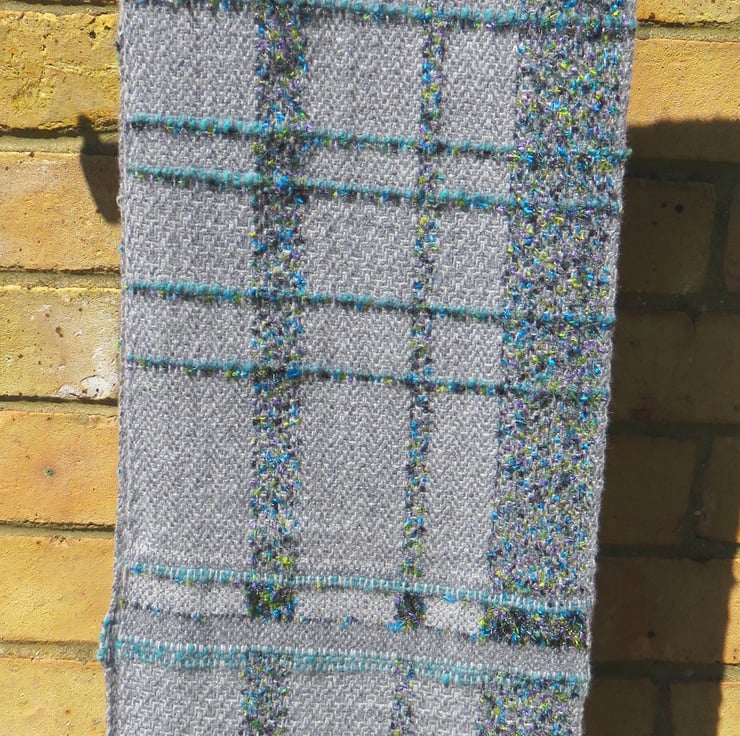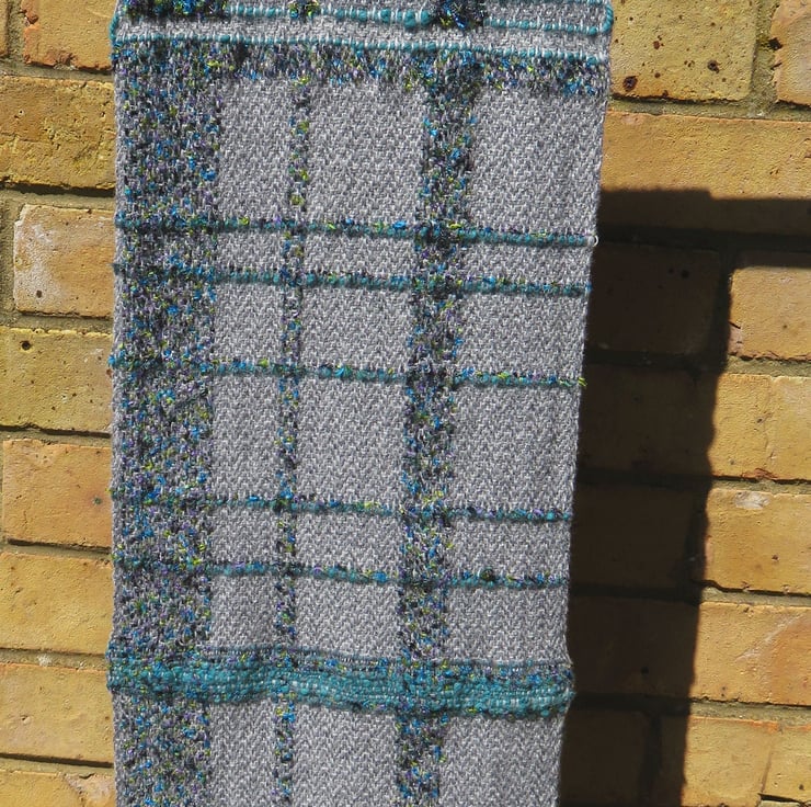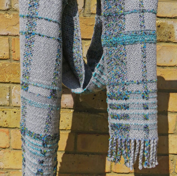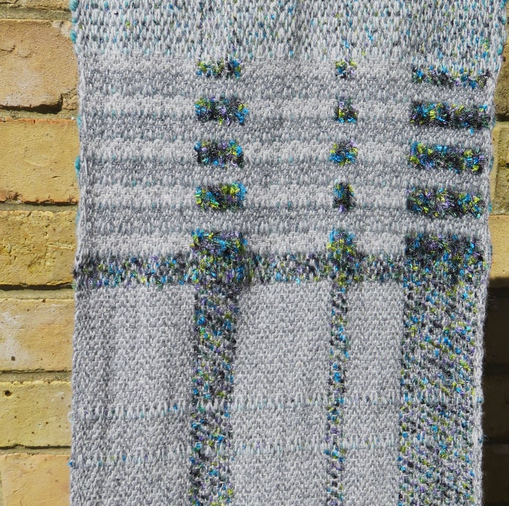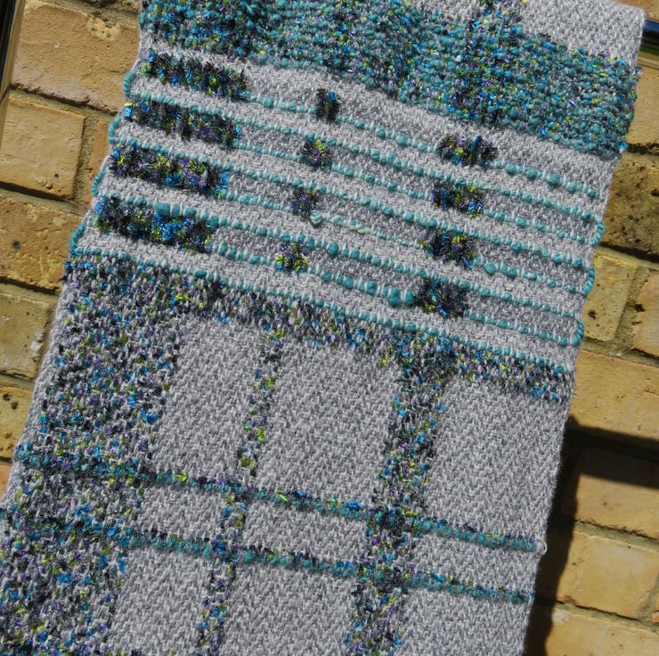 The fancy yarn has been used as stripes down the length of the scarf, sometimes woven in, sometimes leaving little sections of floats.