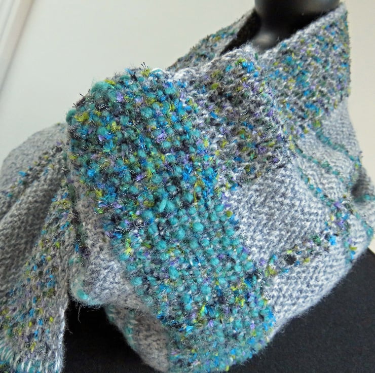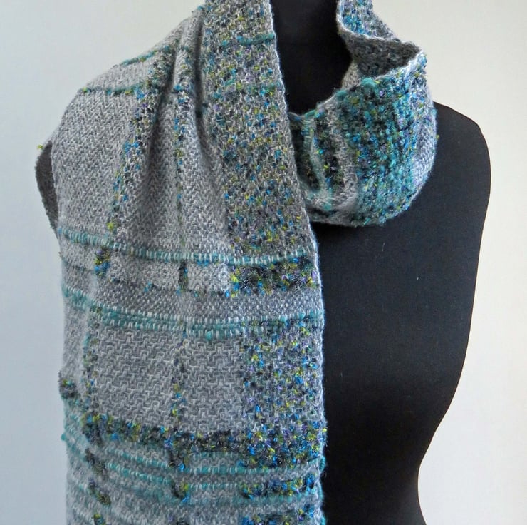 A handwoven scarf, made with lambswool, hand spun yarn (a silk and merino blend) and a fancy yarn. Mostly neutral in colour, with some teal-blue and pops of green.