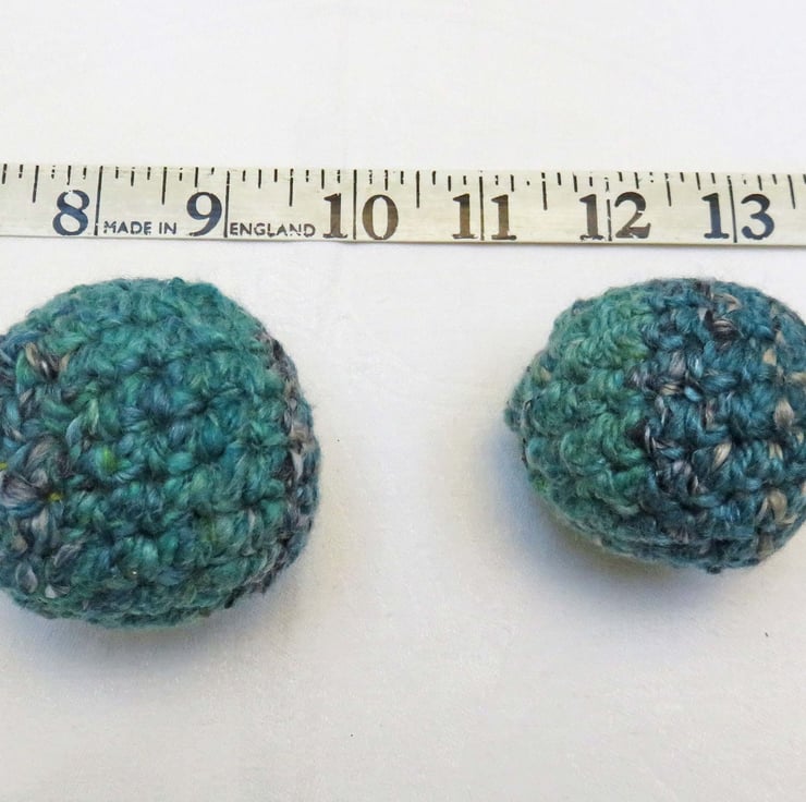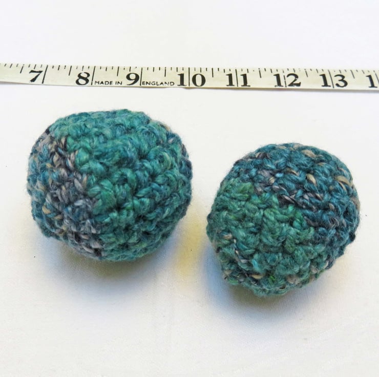 To make them I started by hand spinning yarn -from waste fibres bought from a shop-, then the yarn is plied and then crocheted into balls, stuffed with my waste yarn from weaving and to finish I needle felted them to keep all of the fibres in place.