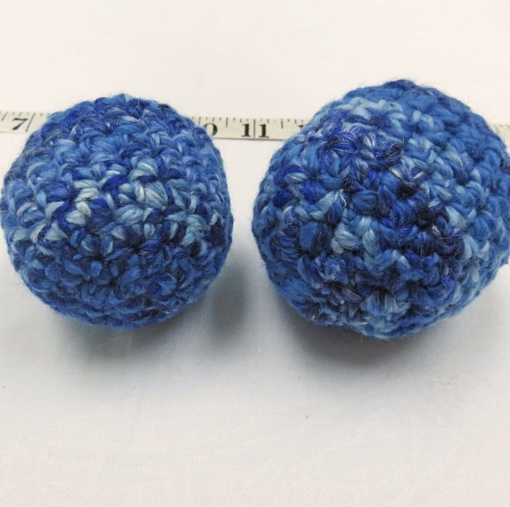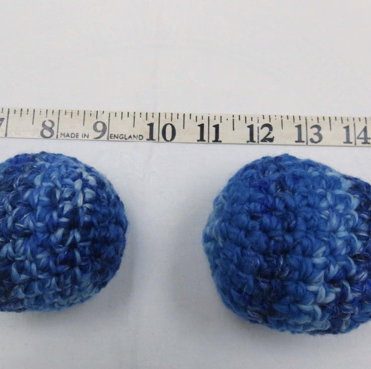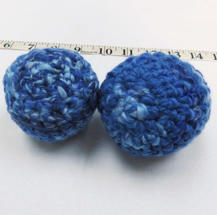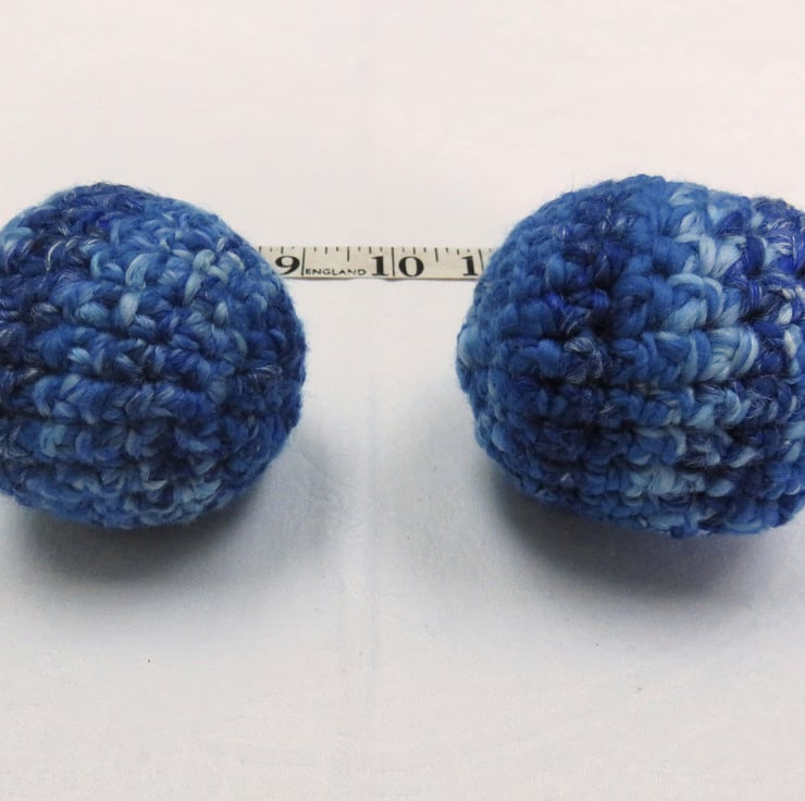 To make them I started by hand spinning yarn (from waste fibres bought from a shop), then the yarn is plied and then crocheted into balls, stuffed with my waste yarn from weaving and to finish I needle felted them to keep all of the fibres in place.