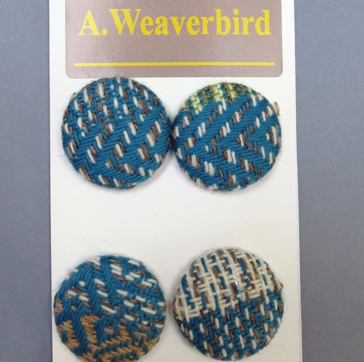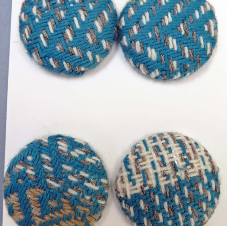Four buttons covered in handwoven lambswool and cotton fabric, this fabric was hand woven by myself on my table loom, and was created as a result of testing out a warp before I made the intended item, usually a scarf.