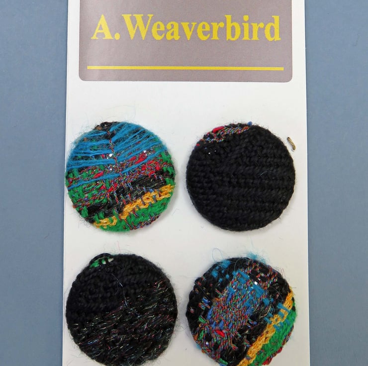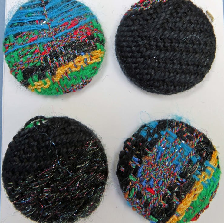 Four buttons covered in handwoven fabric, this fabric was hand woven by myself on my table loom, and was created as a result of testing out a warp before I made the intended item, usually a scarf.