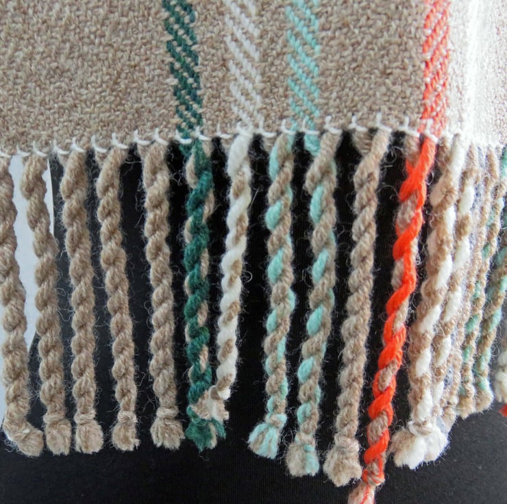 This scarf is handmade, including hand finished - twisting the tassels, washing, trimming, stitching on the label and pressing.