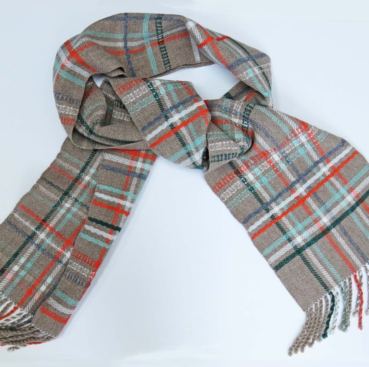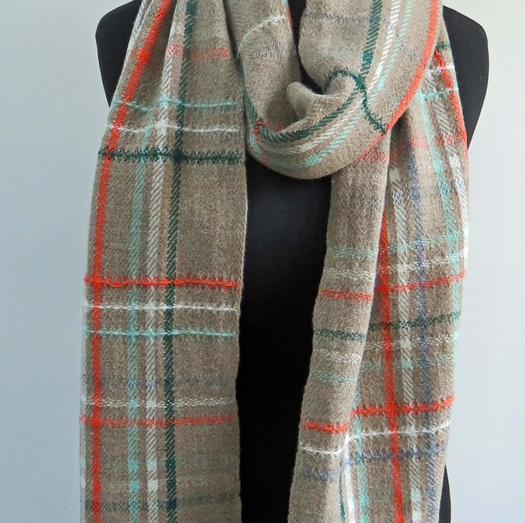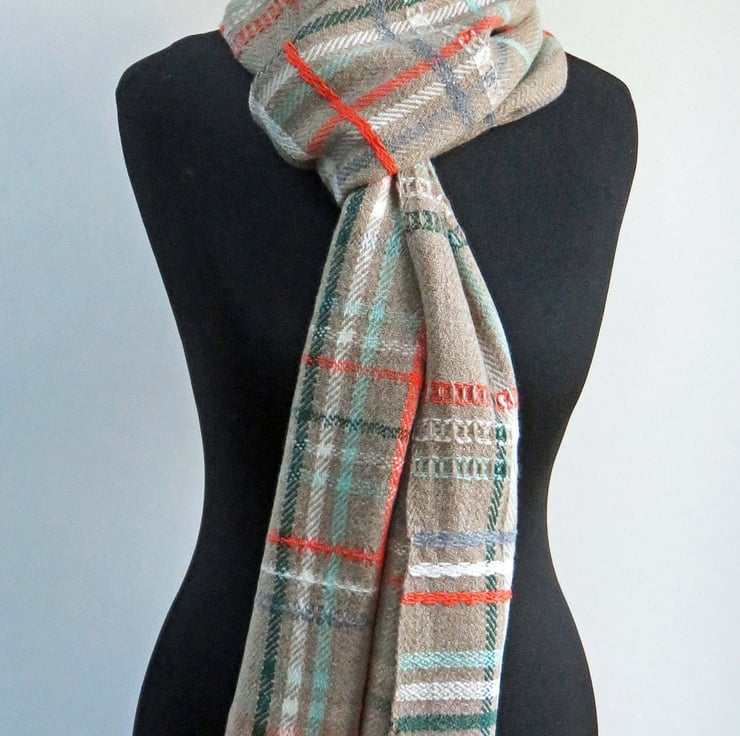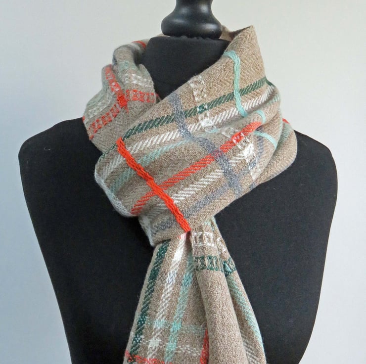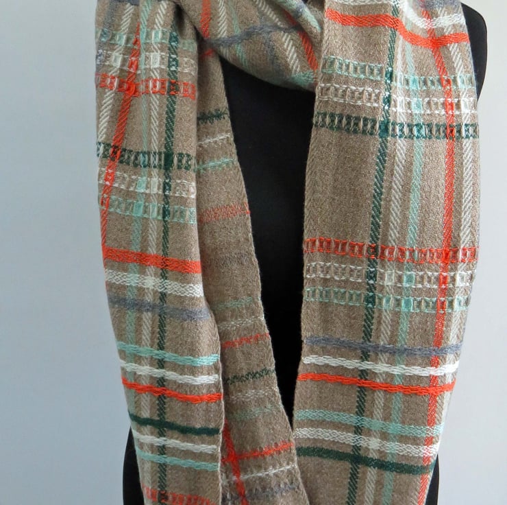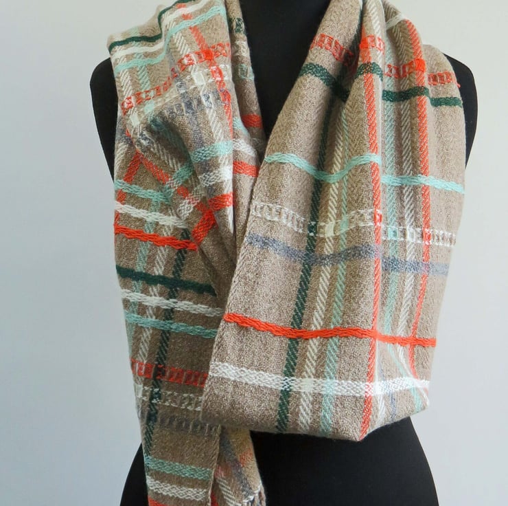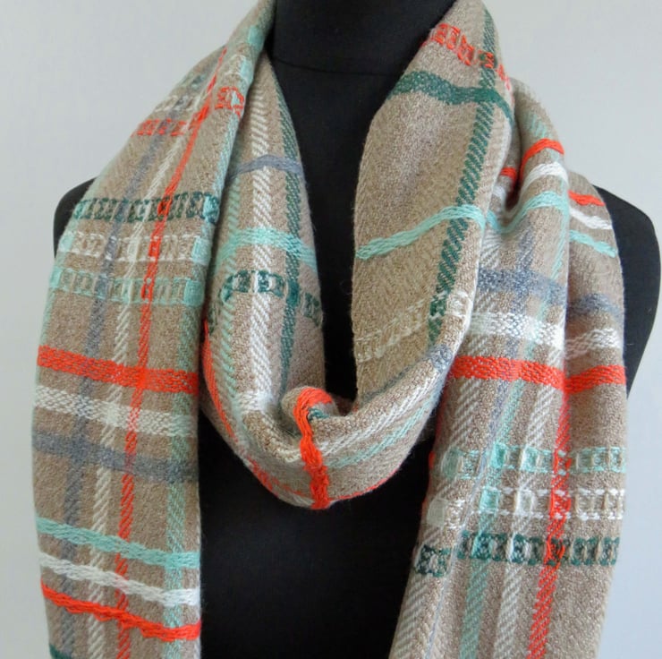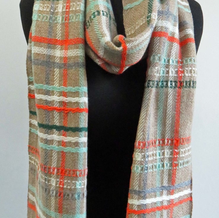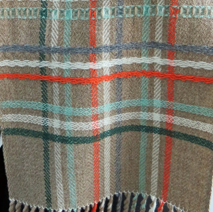 A soft neutral brown background, with 3 sets of stripes running down the length and then repeated in the weft. - the orange cotton is not as bright as it looks in the photographs, the colours of this scarf were a bit tricky to show accurately when photographed.