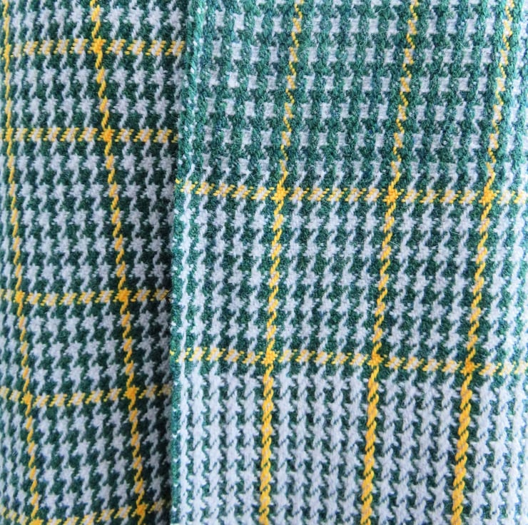 Predominantly woven in a traditional hounds tooth pattern, with sections of -what I think of as- 'stars' in both the green and grey.