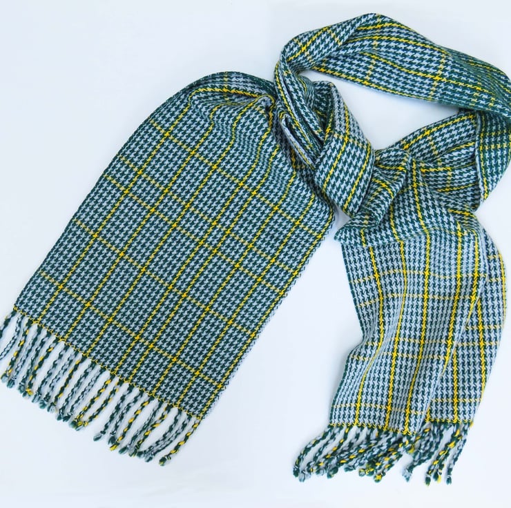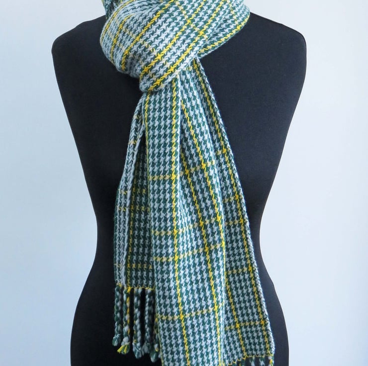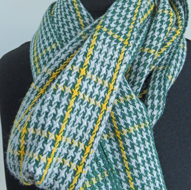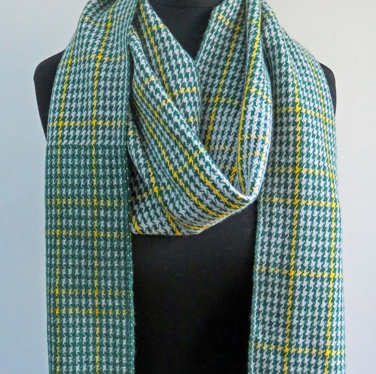 A handwoven scarf in dark green and a light grey lambswool, with randomly placed highlights of yellow cotton stripes, this scarf is unique and I will not recreate it.