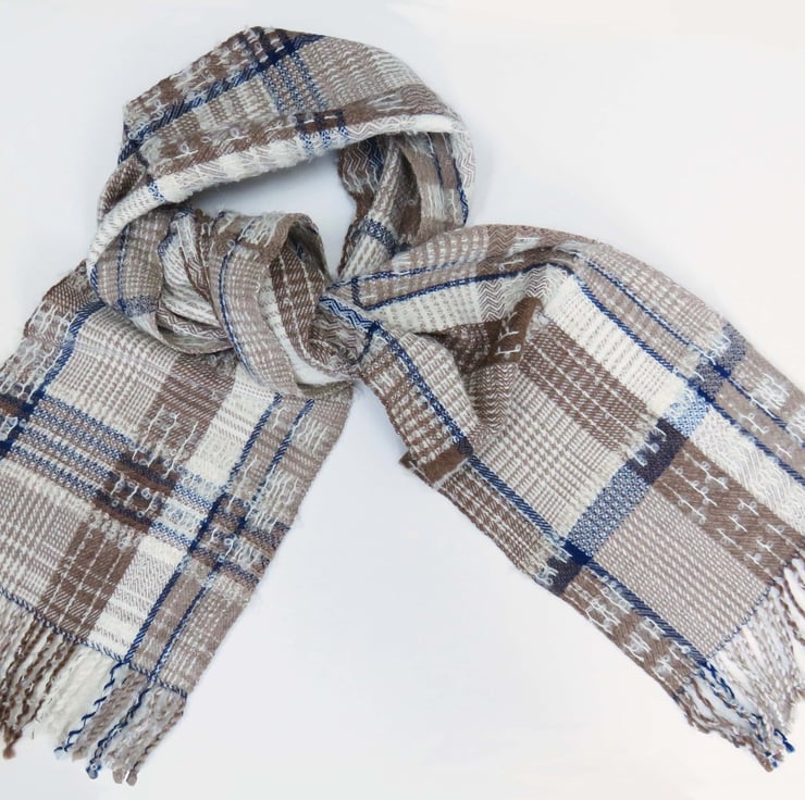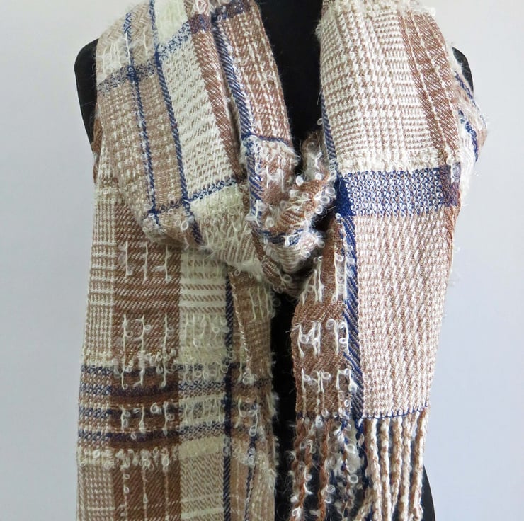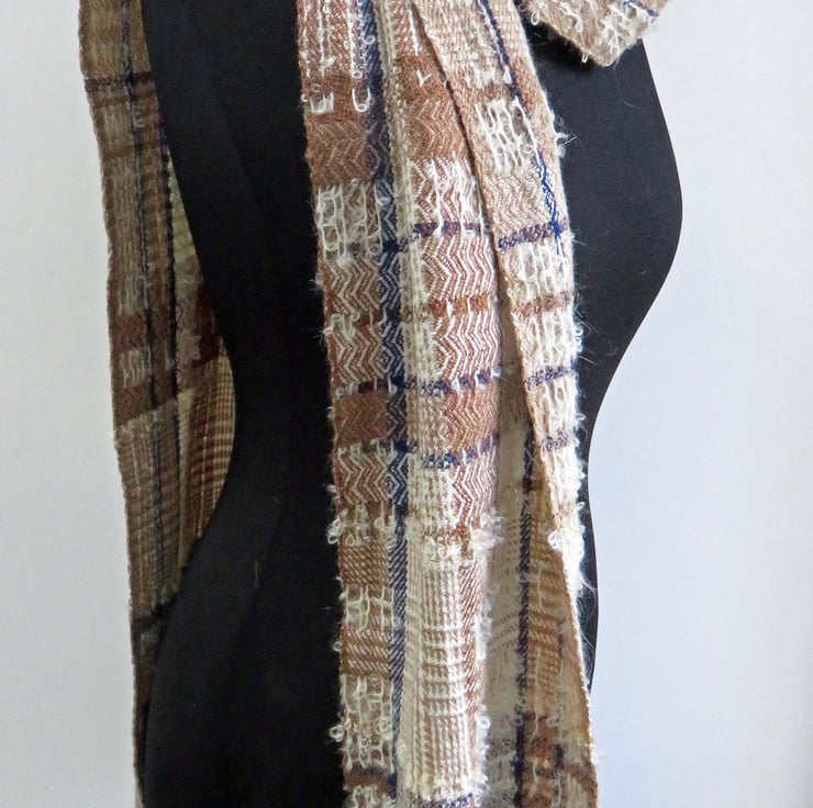 A handwoven (on my table loom) and entirely hand finished scarf, which includes twisting tassels, washing, trimming, sewing on the label and pressing.