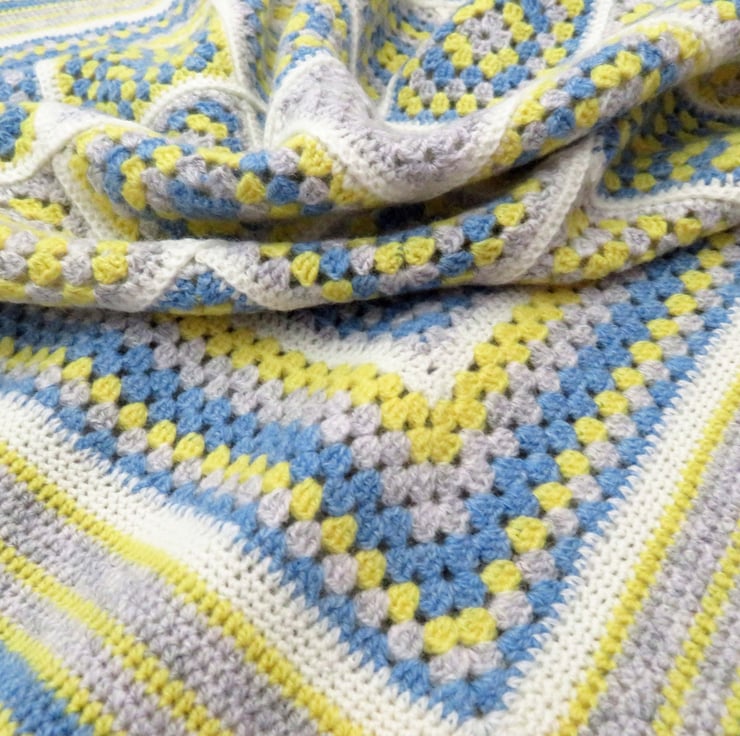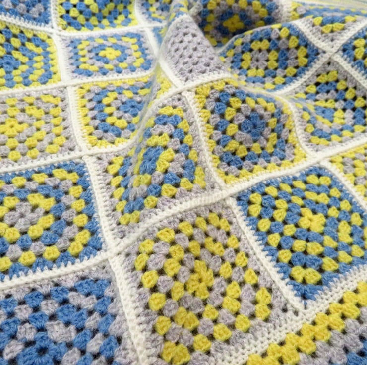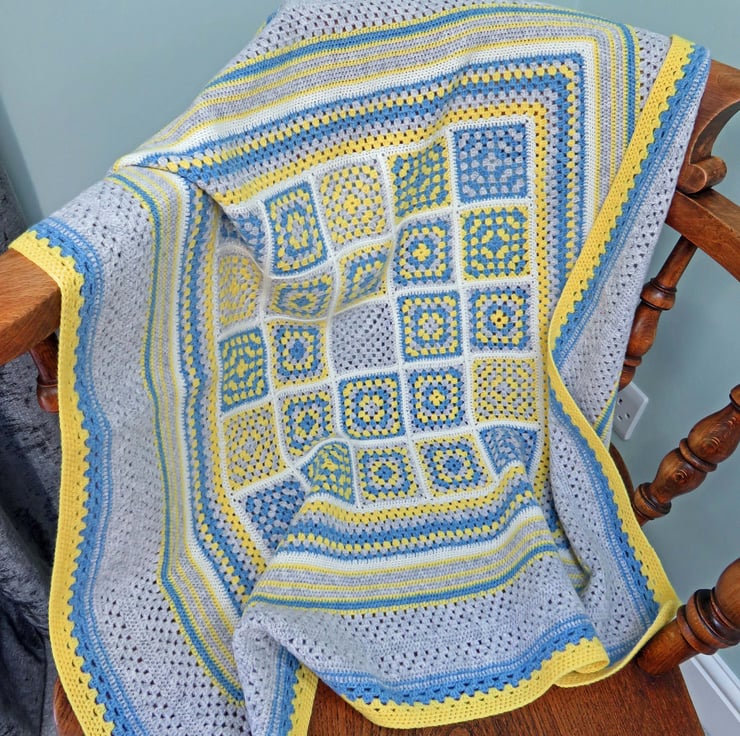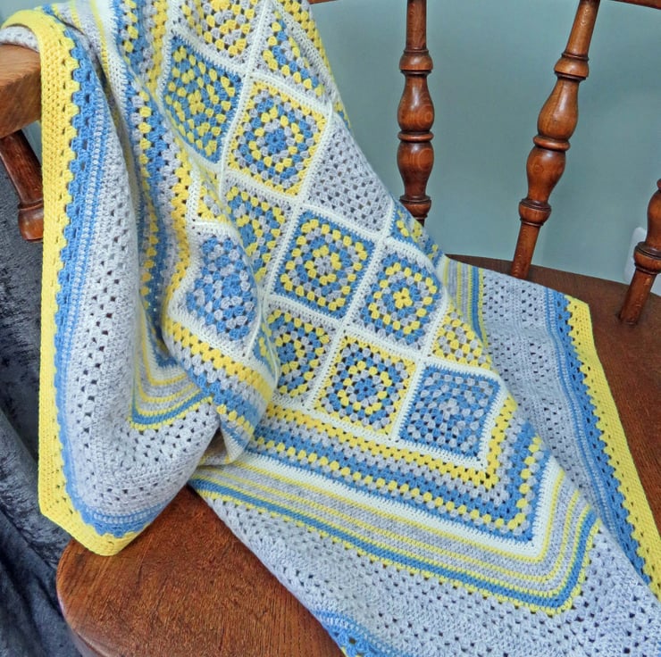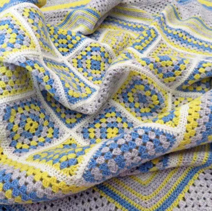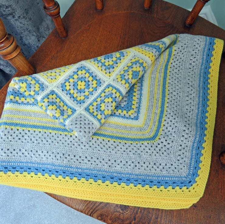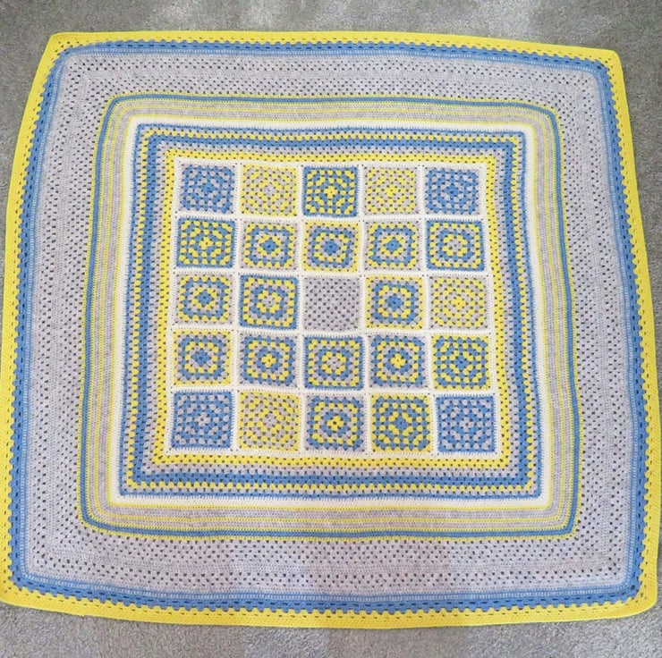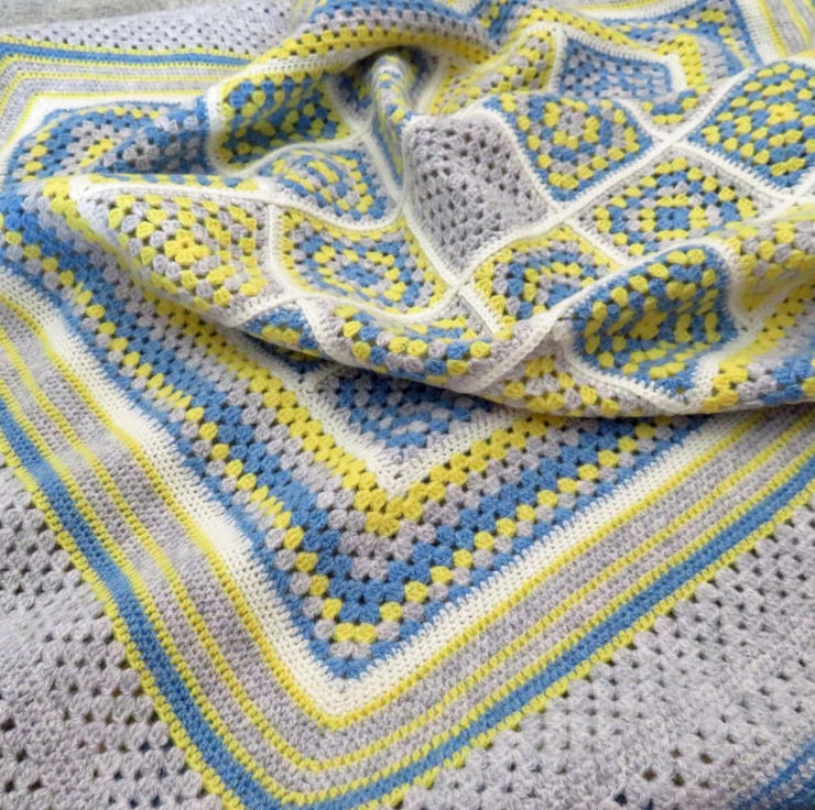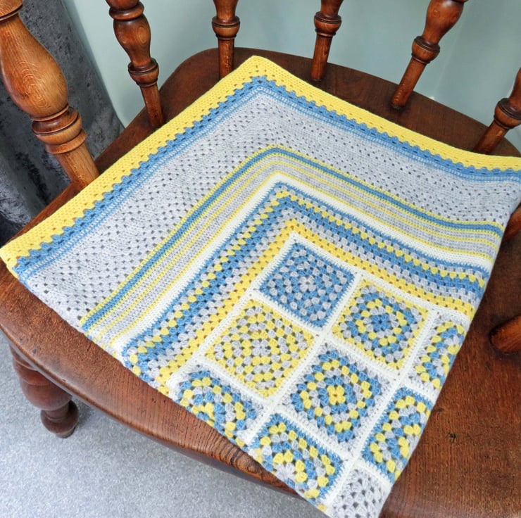Crocheted in blue, light grey, pastel yellow and a little bit of white.