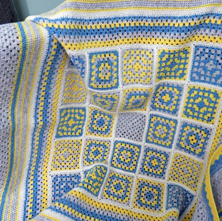 The centre of the blanket is made up of a grid of granny squares all connected with the white, and then there are rounds continuing outside this in a mix of the granny square stitch and a tighter stitch which creates a more solid section of fabric.