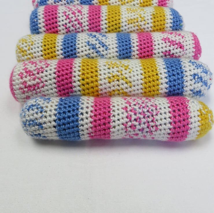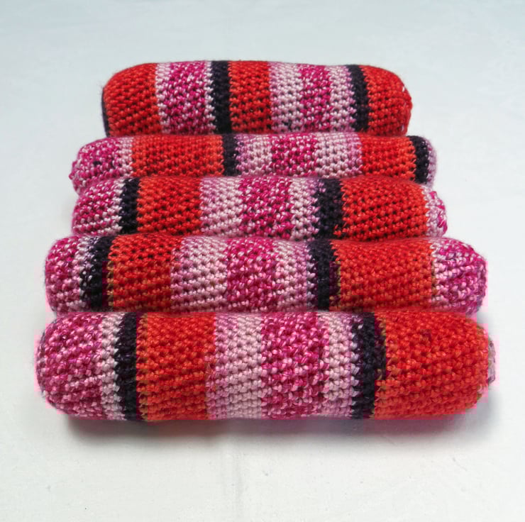 The stuffing is predominantly made up of my weaving waste yarn, as well as some of my crochet waste yarn and therefore is mostly natural fibres. - outer shell is acrylic yarn.