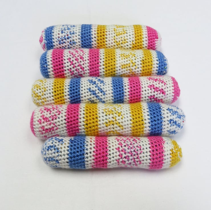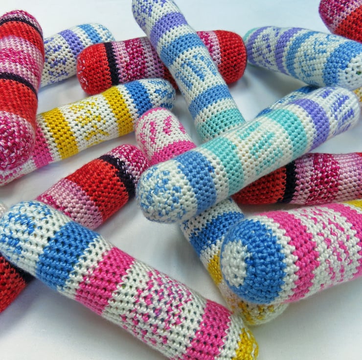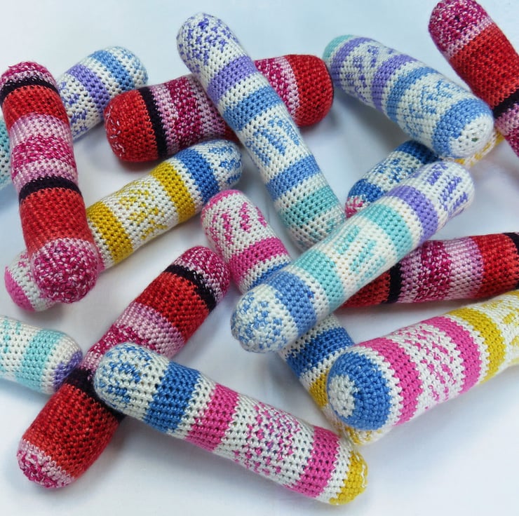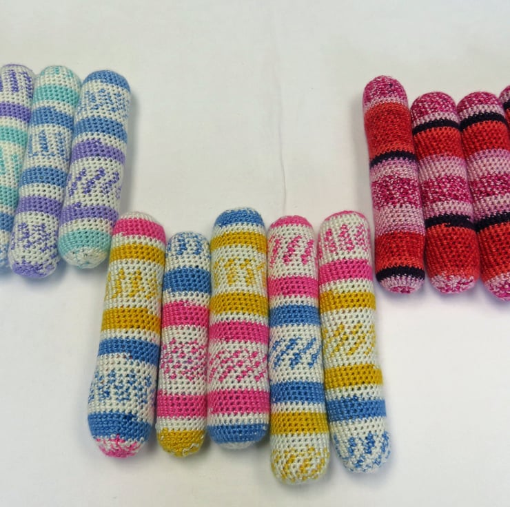 I save all of the yarn wastage that I produce while weaving and use it for the stuffing of the cat toys I make; by doing this the only waste I actually produce is water from washing my weaving, which means that all of my cat toys are extremely eco friendly because they use all yarn waste that can be repurposed. - I also Have these in different colours in my shop