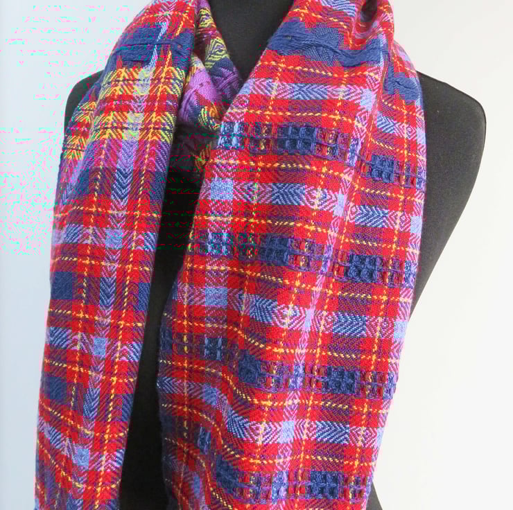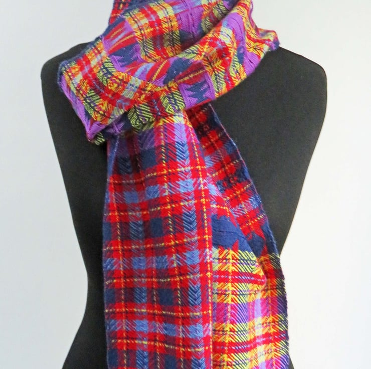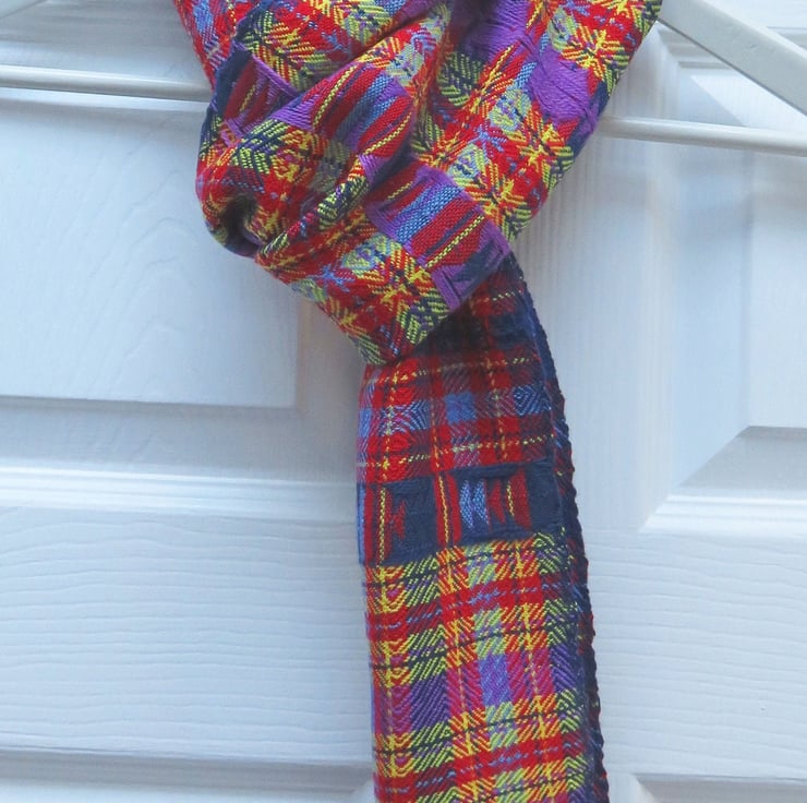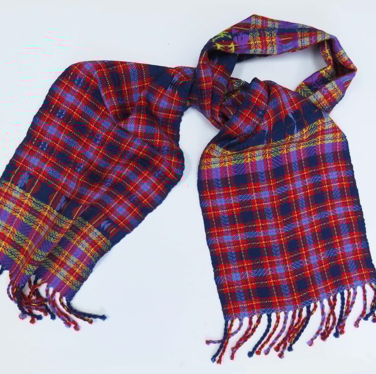 A handwoven tartan scarf, made from 100% fine Merino wool. This scarf was woven on a Table Loom, meaning everything is done entirely by hand, and then finishing includes: hemstitching, twisting the tassels, washing, attaching the label and pressing.