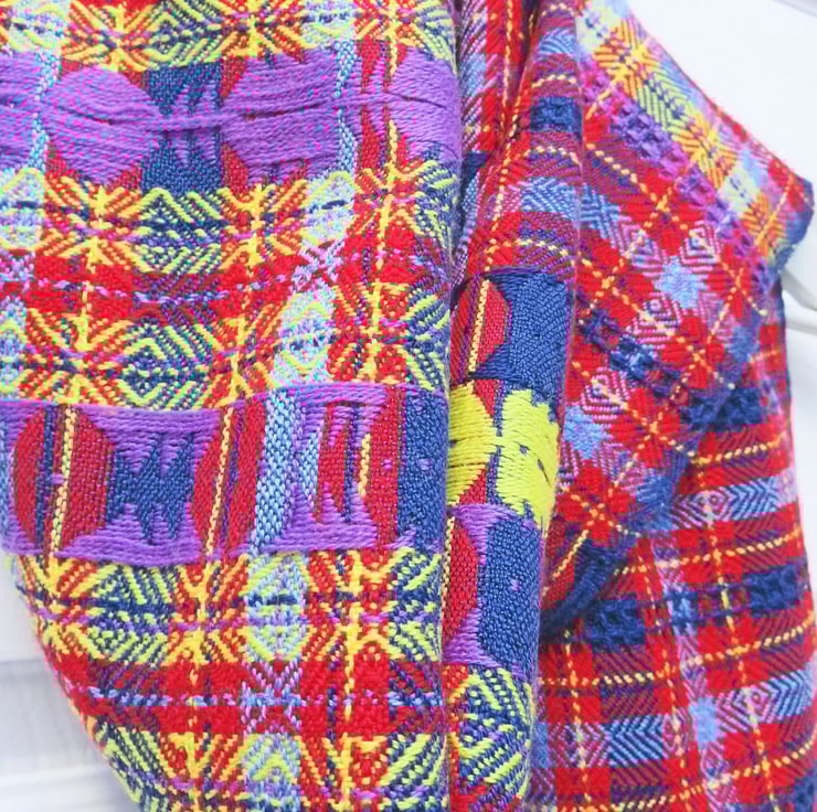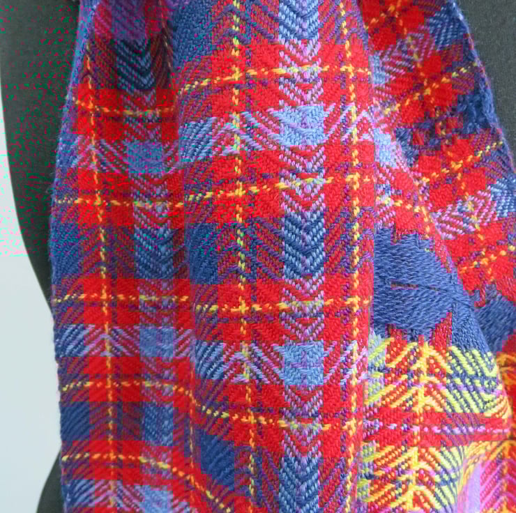 This is one of my more "traditional" tartans in terms of the colours used and the pattern created by the colours. However it also has a very contemporary feel to it where the colours have been switched round so the main colour is yellow instead of the red, and there are also stripes of "circles", which use both the merino wool and a silk yarn.