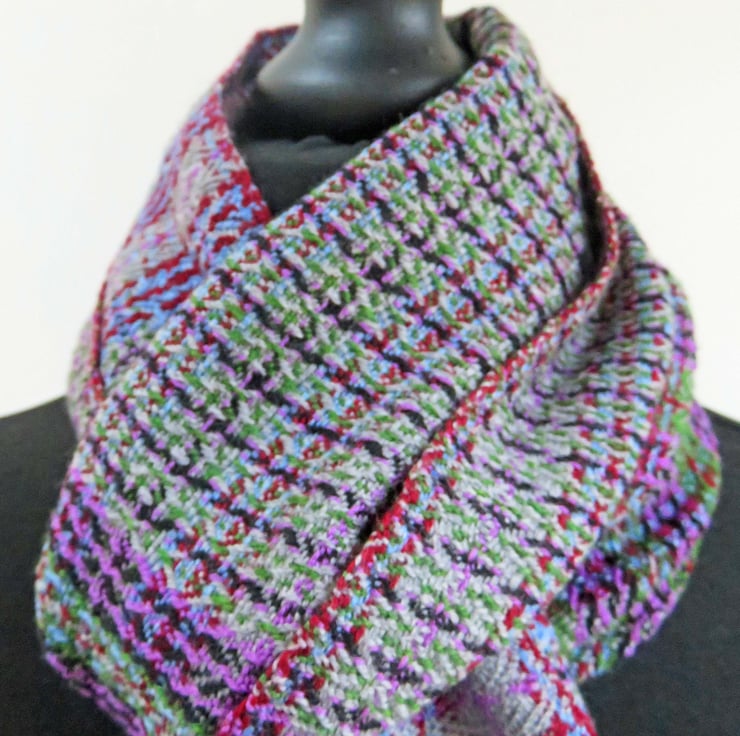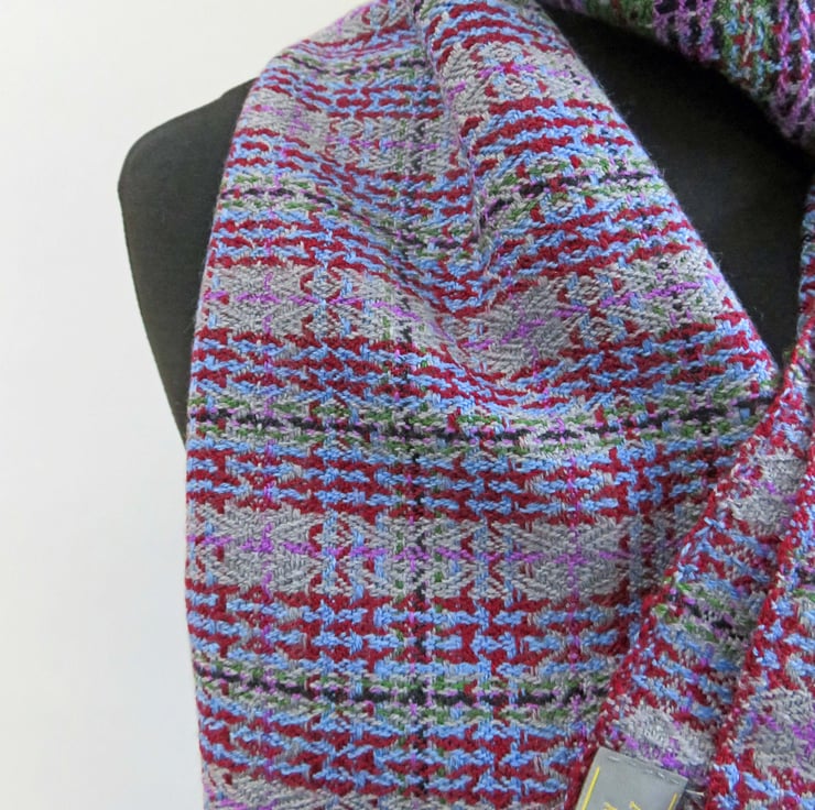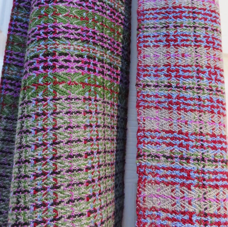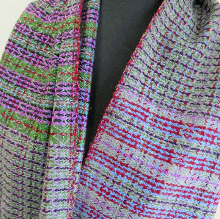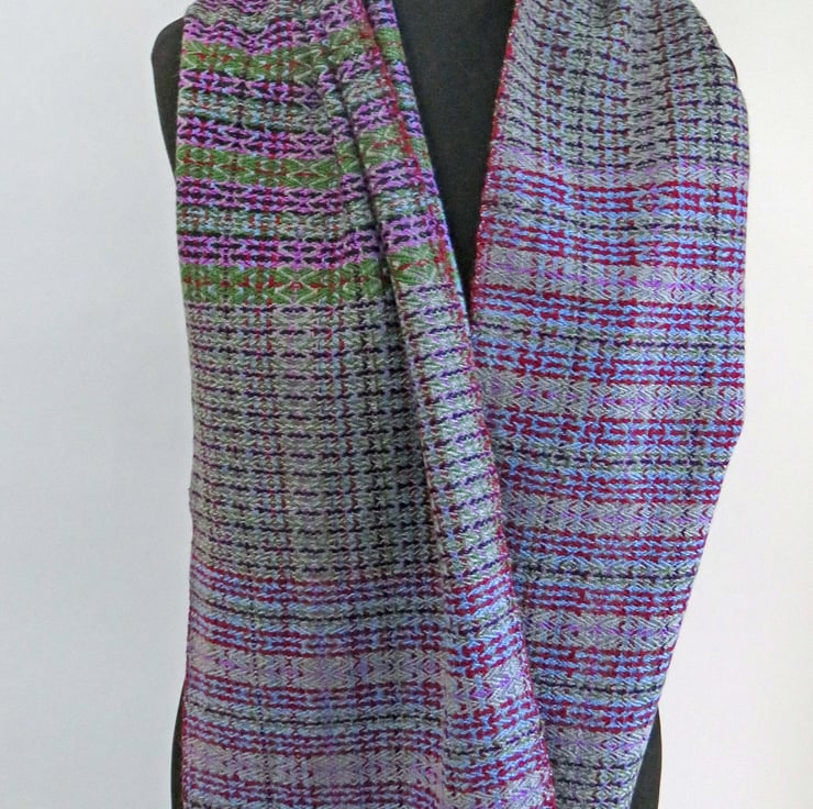 The structural pattern of this scarf is a slightly stretched diamond shape repeating across the width and up the length. A tartan but with contemporary use of colours which are not unusual in more traditional tartans, with a section of the pattern repeated in the weft to create larger sections to break up and add some interest to the main pattern.