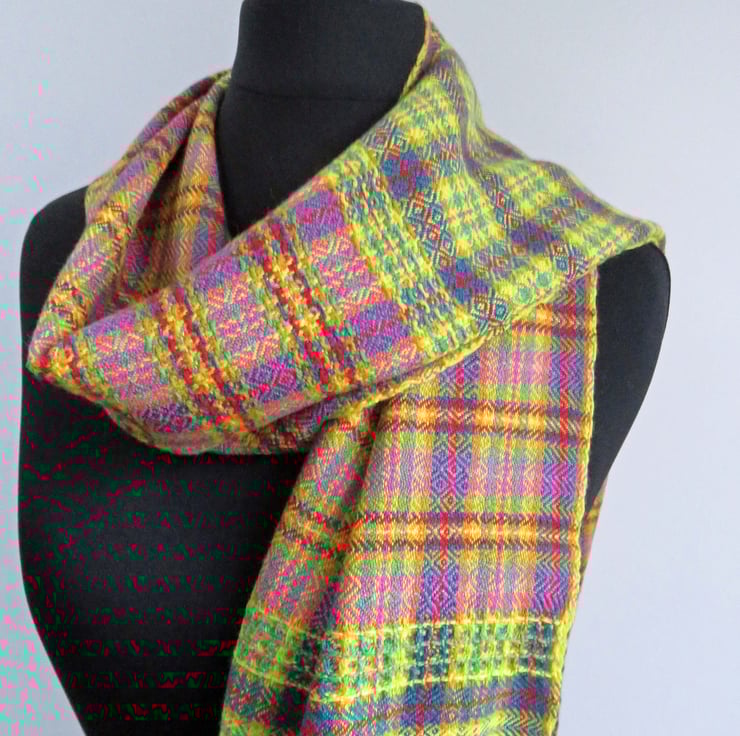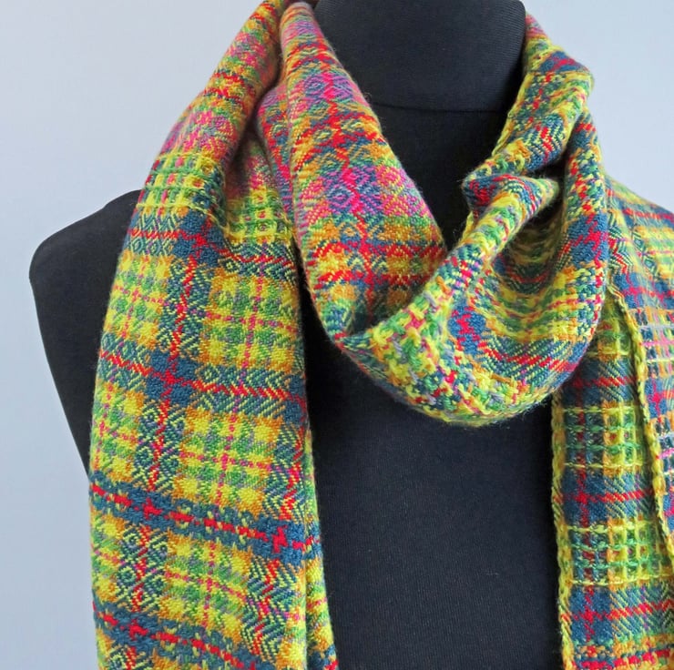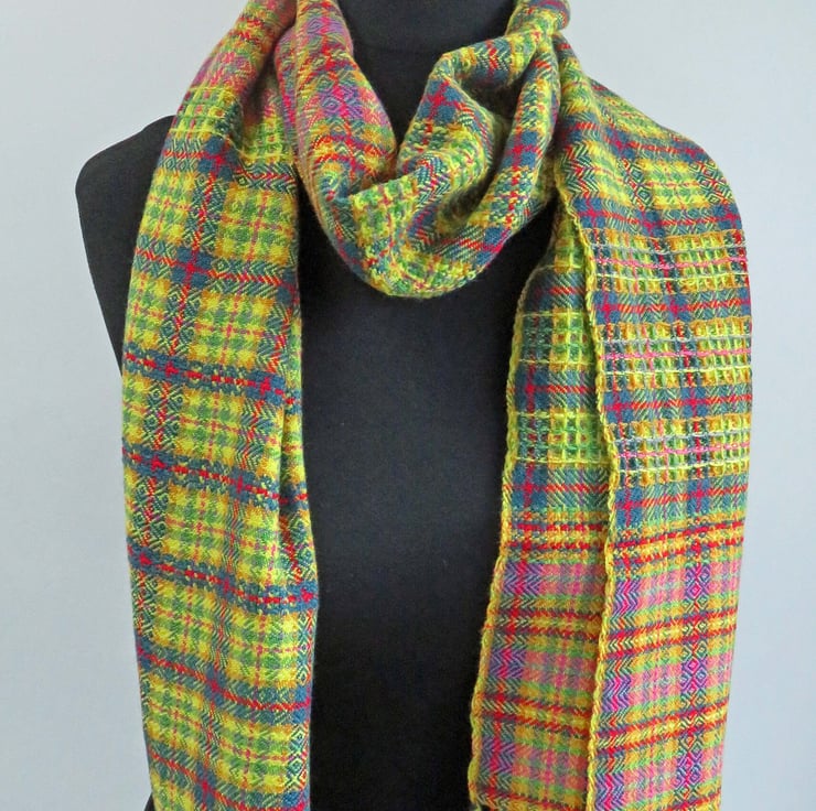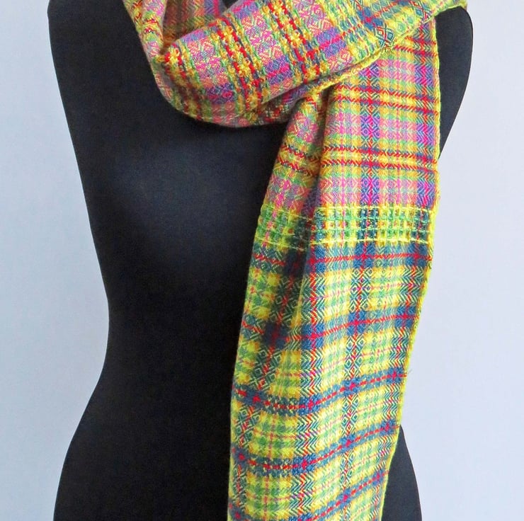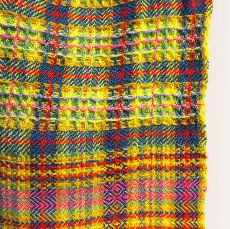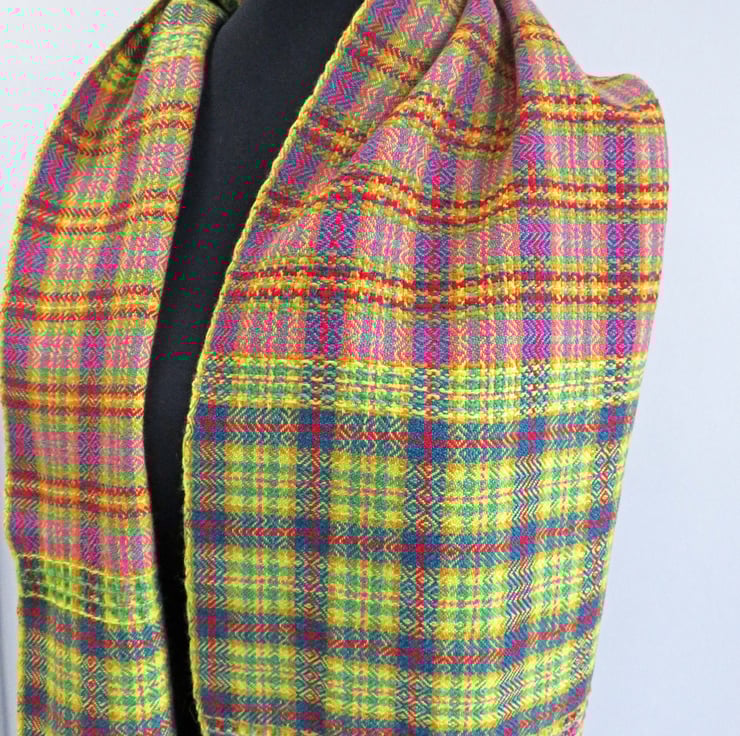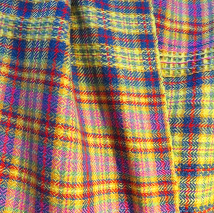 Most of this scarf is woven as a traditional tartan - in its' main colourway - made up of a few different woven structures that repeat throughout the scarf. There are also sections where the colours have been reallocated in the weft giving more of a pink overall colour in those areas.