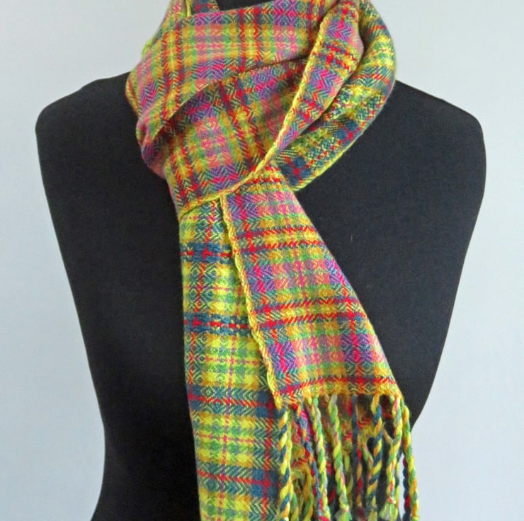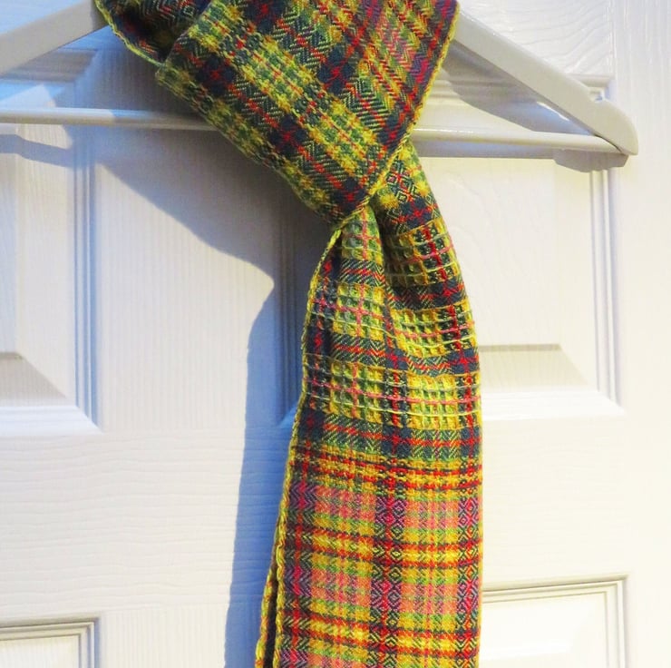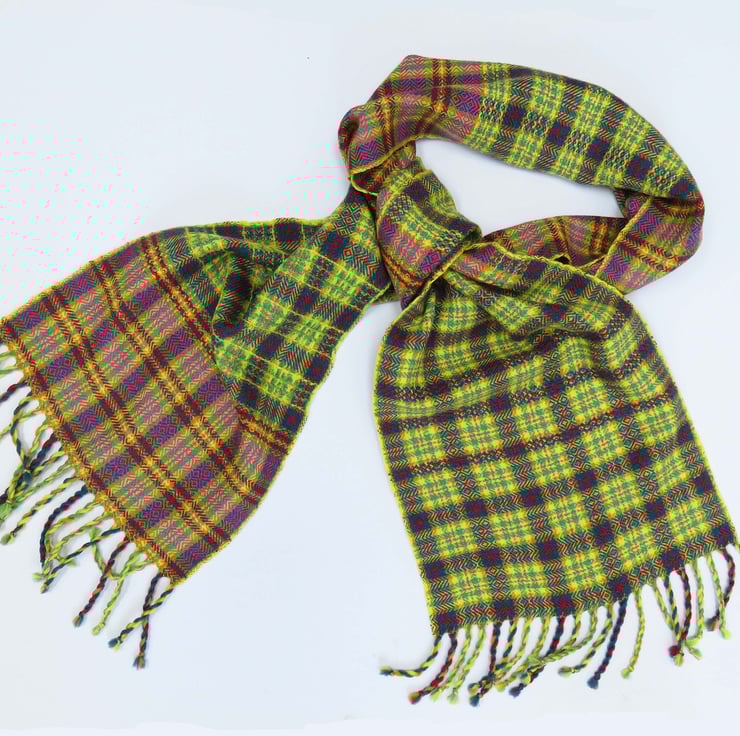 A handwoven tartan scarf, made from 100% fine Merino wool. This scarf was woven on my table Loom, meaning that everything is done entirely by hand, and then finishing includes: hemstitching, twisting the tassels, washing, attaching the label and pressing.