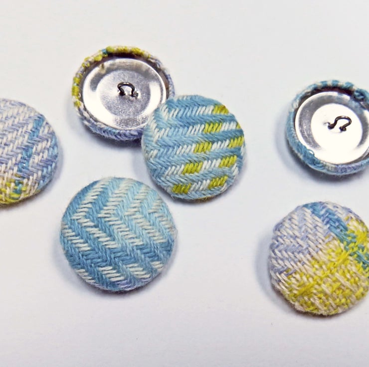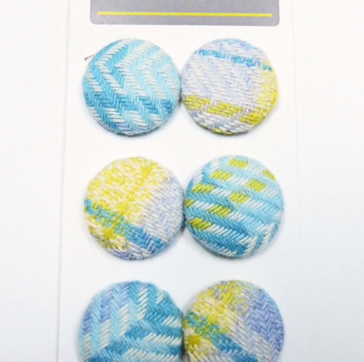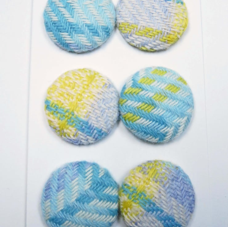 Six buttons covered in handwoven lambswool fabric, this fabric was hand woven by myself on my table loom, and was created as a result of testing out a warp before I made the intended item, usually a scarf, these are from a warp for a baby blanket, or from using up the end of a warp when making a product.