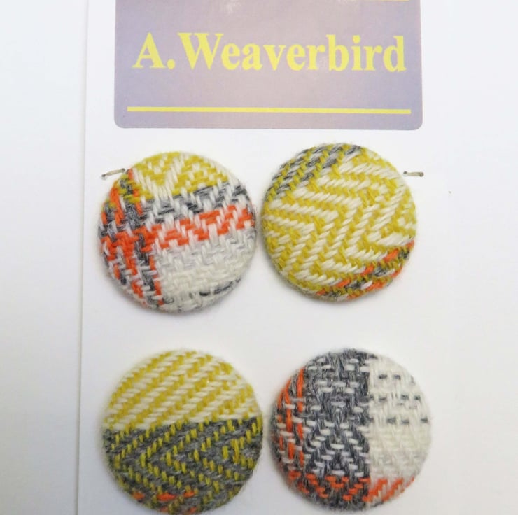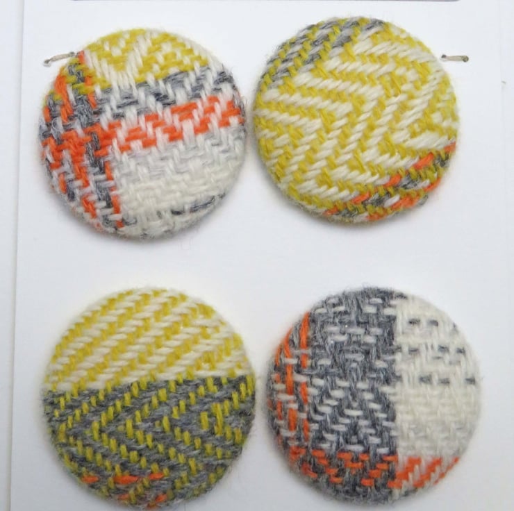 Four buttons covered in handwoven lambswool fabric, this fabric was hand woven by myself on my table loom, and was created as a result of testing out a warp before I made the intended item, usually a scarf, or from using up the end of a warp when making a product.
