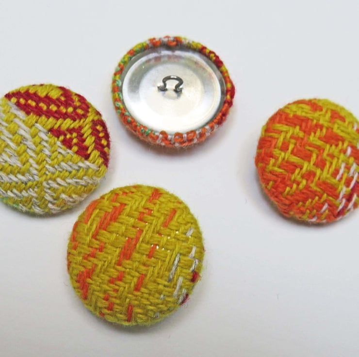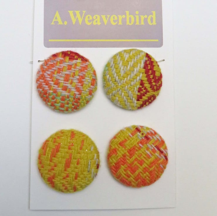 Four buttons covered in handwoven lambswool fabric, this fabric was hand woven by myself on my table loom, and was created as a result of testing out a warp before I made the intended item, usually a scarf, or from using up the end of a warp when making a product.