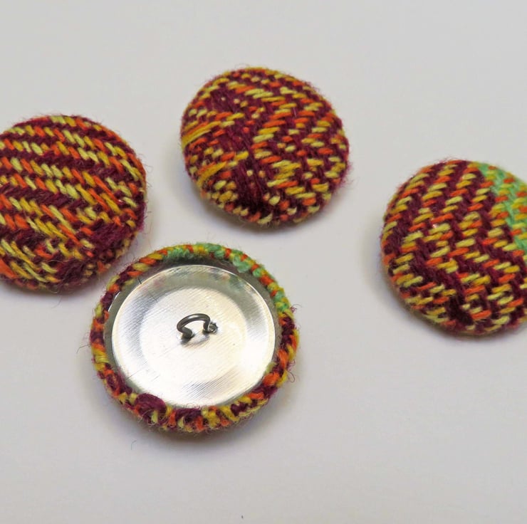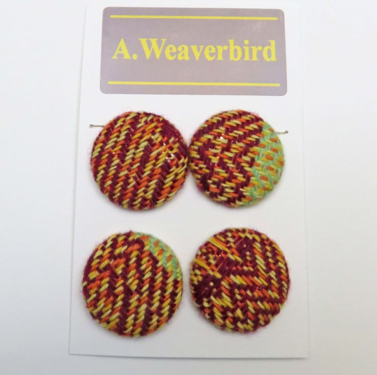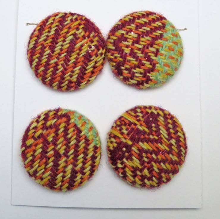 Four buttons covered in handwoven lambs wool fabric, this fabric was hand woven by myself on my table loom, and was created as a result of testing out a warp before I made the intended item, usually a scarf, or from using up the end of a warp when making a product.