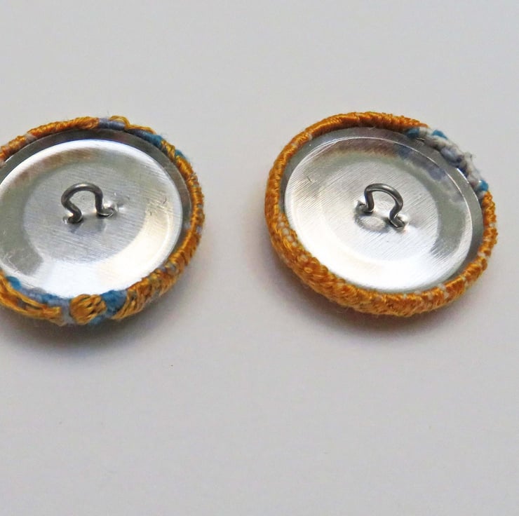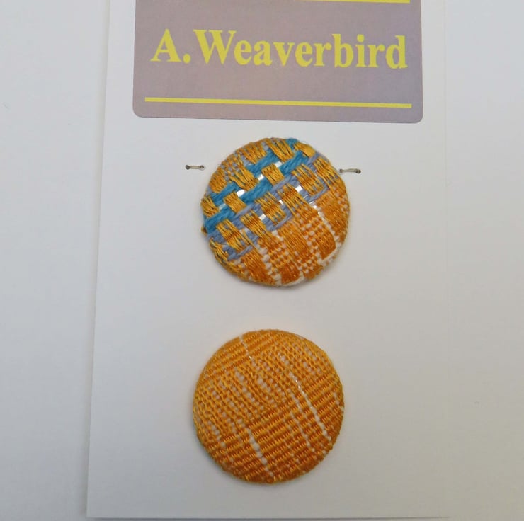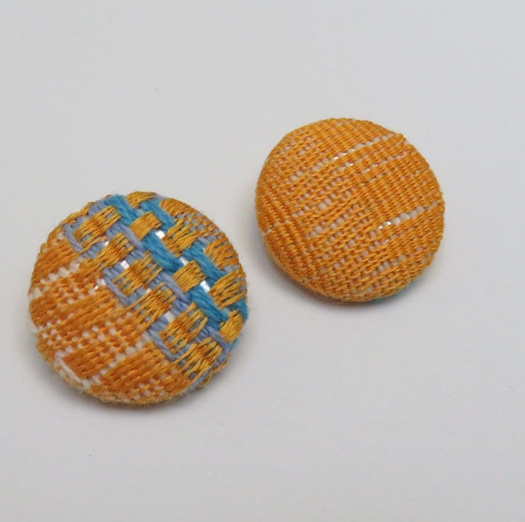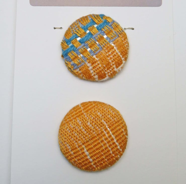 Two buttons covered in handwoven silk and lambs wool fabric, this fabric was hand woven by myself on my table loom, and was created as a result of testing out a warp before I made the intended item, usually a scarf or from using up the end of a warp when making a product.