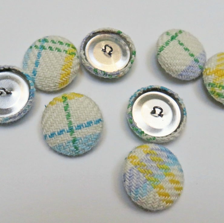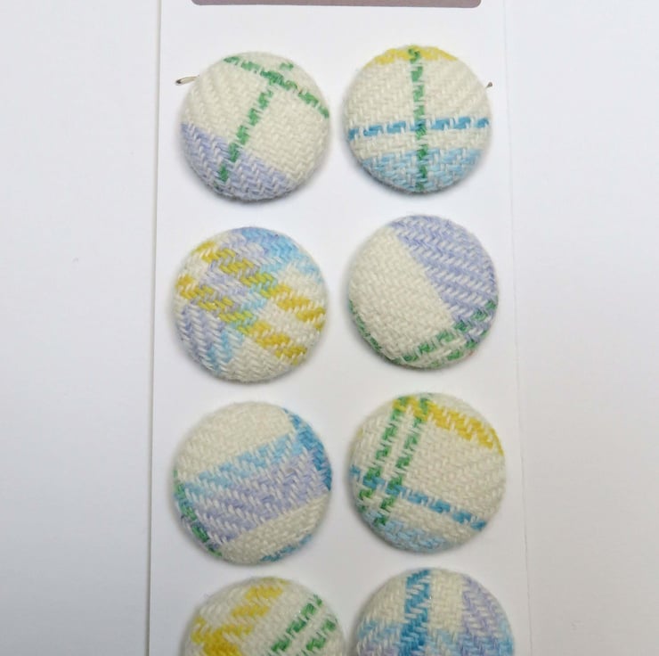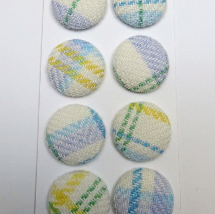 8 buttons covered in handwoven lambswool fabric, this fabric was hand woven by myself on my table loom, and was created as a result of testing out a warp before I made the intended item, usually a scarf, these are from testing a baby blanket, or from using up the end of a warp when making a product.