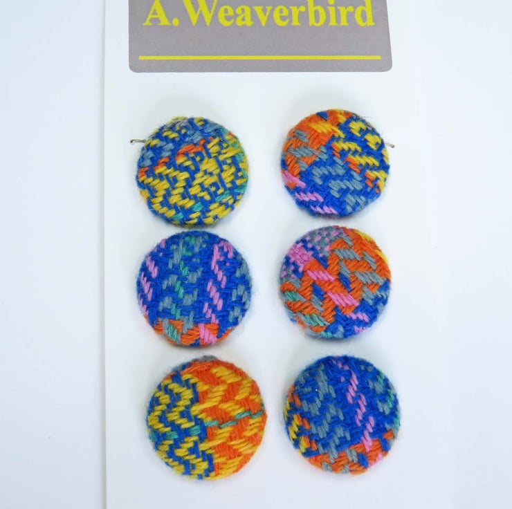 Six buttons covered in handwoven lambswool fabric, this fabric was hand woven by myself on my table loom, and was created as a result of testing out a warp before I made the intended item, this was from a scarf warp, or from using up the end of a warp when making a product.