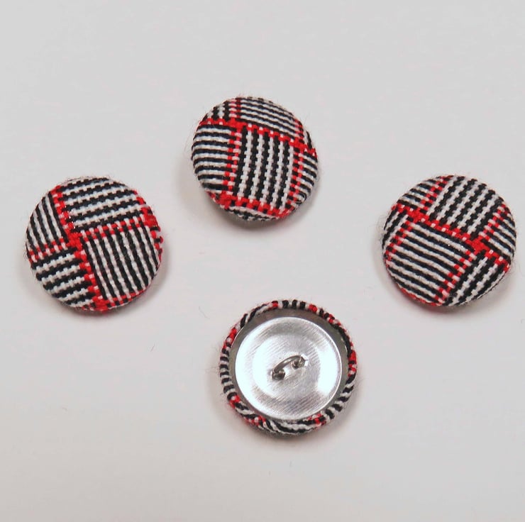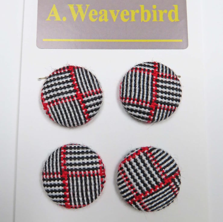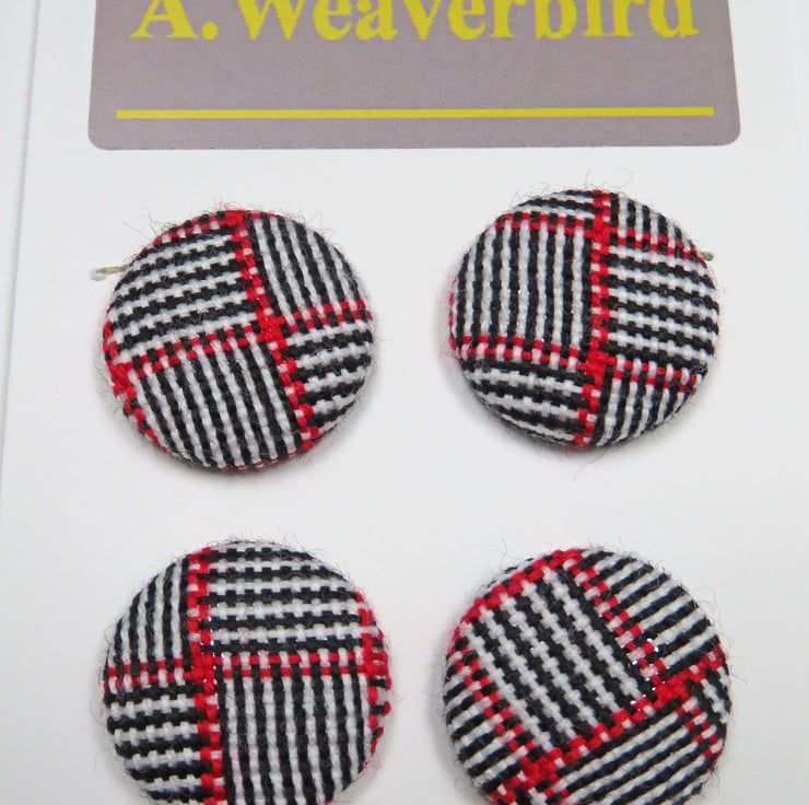 Four buttons covered in handwoven merino wool fabric, this fabric was hand woven by myself on my table loom, and was created as a result of testing out a warp before I made the intended item, usually a scarf, or from using up the end of a warp when making a product.