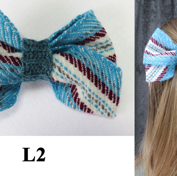 Handwoven and hand finished bows made from lambswool and Shetland wool, with an alligator clip.