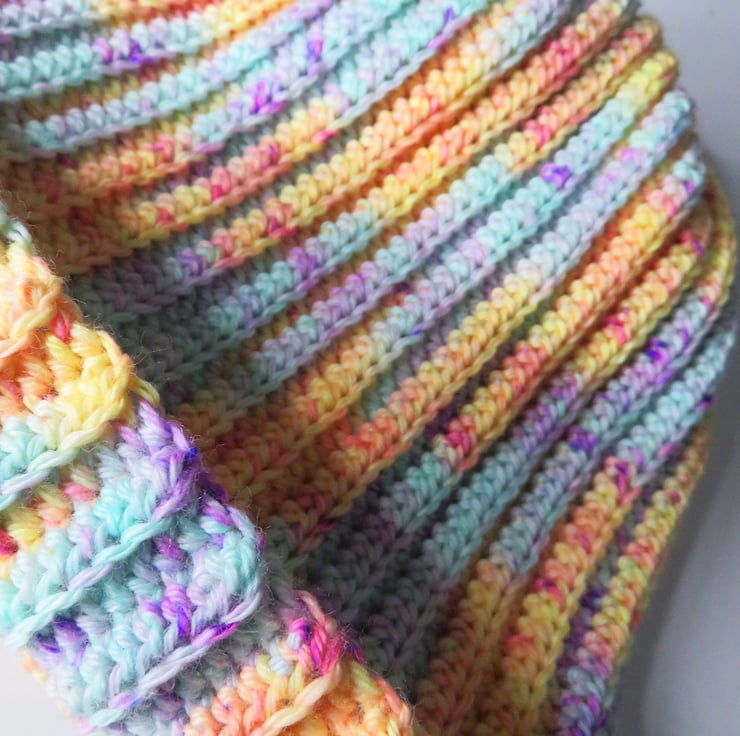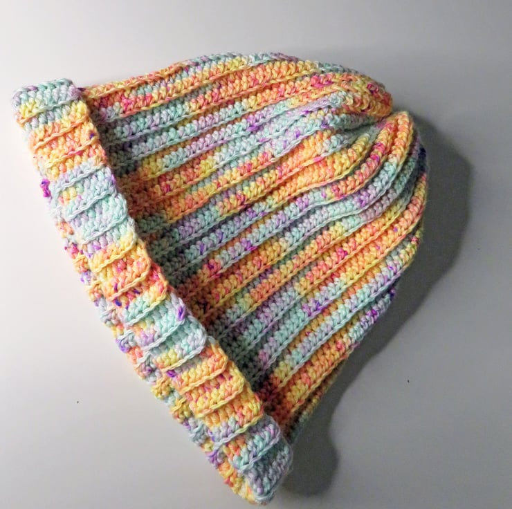 Crocheted using hand-dyed merino wool and nylon yarn, the colours alternate between a warm orange-y yellow to a cool pale blue with little spots of purple. When the brim is not rolled up, you can see that how the yarn was dyed and then crocheted has created an over lapping diagonal pattern with the colours.