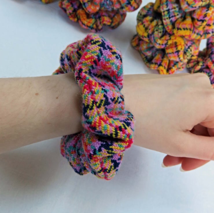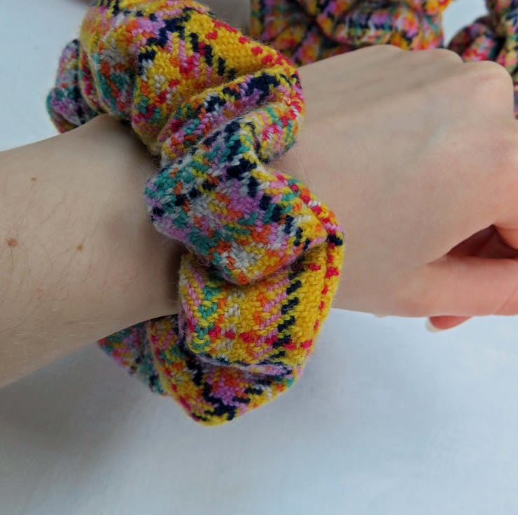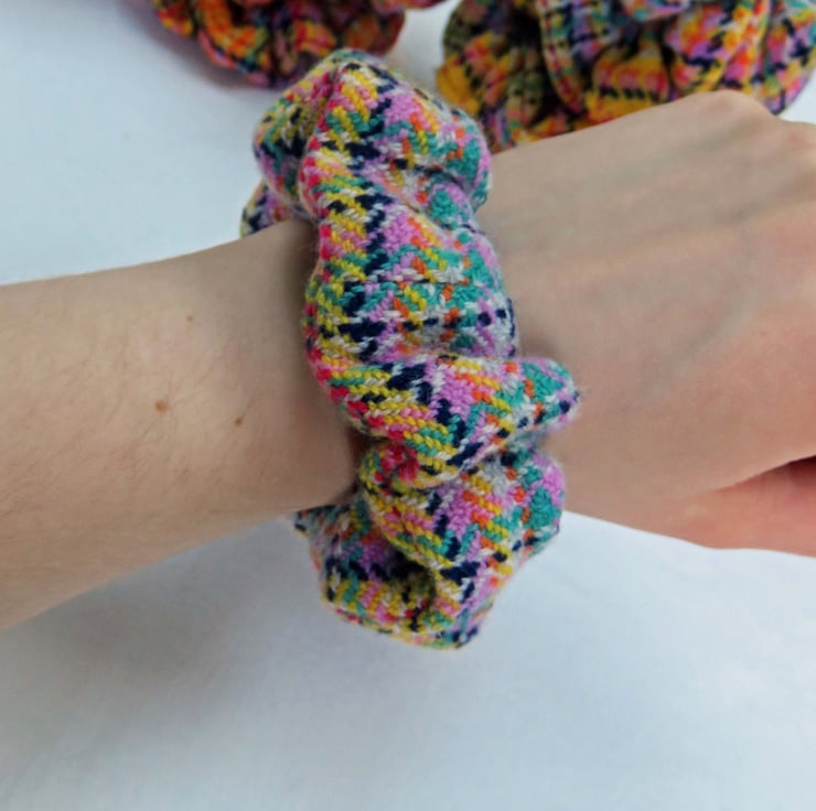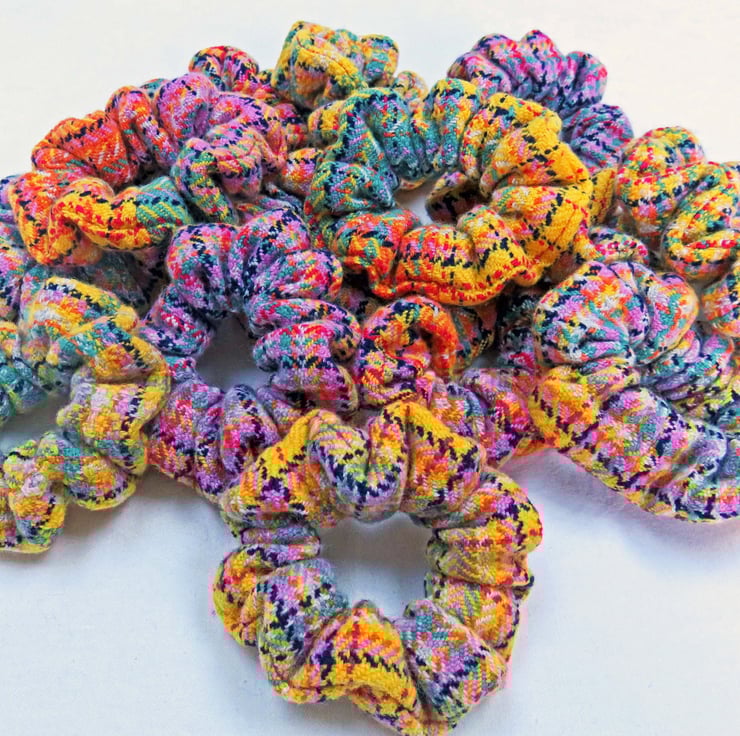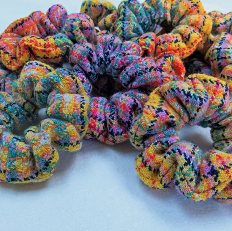 All the scrunchies are made from handwoven fabric, woven on my table loom and then sewn together on a sewing machine, an elastic band inserted and then finished by hand.