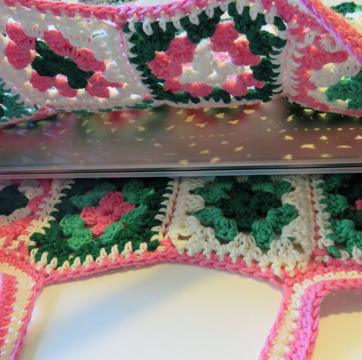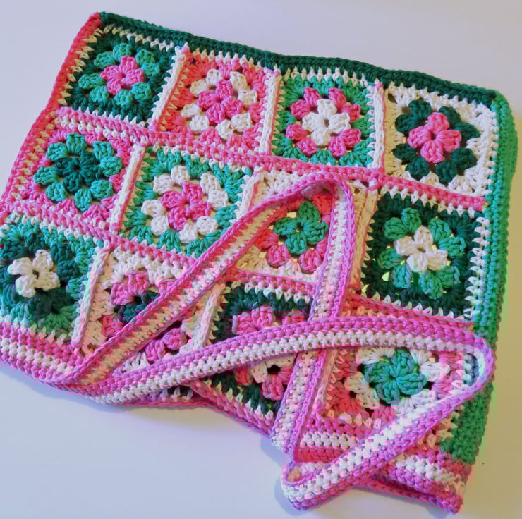 A crochet shoulder bag with a granny square grid design on the front and back, in a cotton yarn.