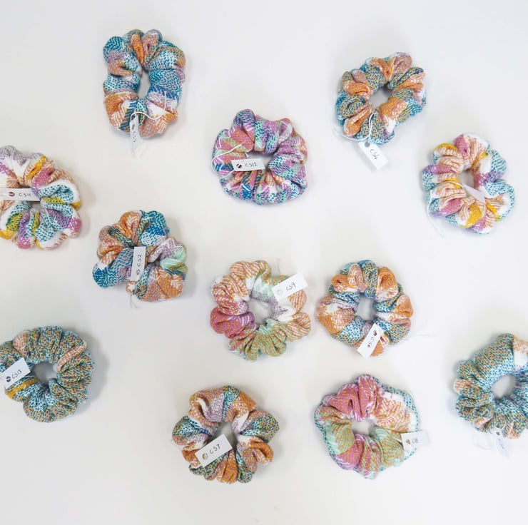 All the scrunchies are made from handwoven fabric, woven on my table loom and then sewn together on a sewing machine, an elastic band inserted and then finished by hand.