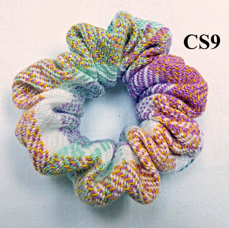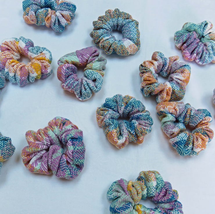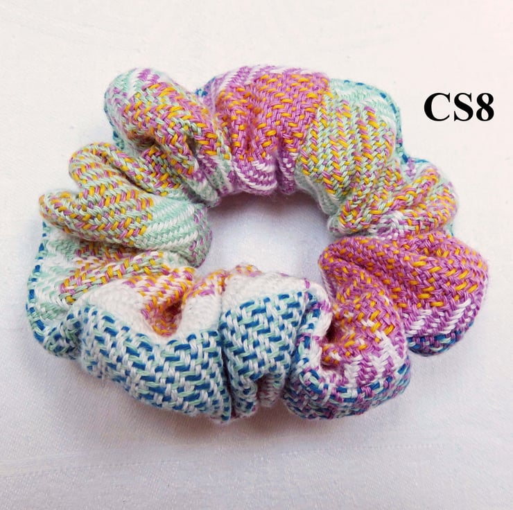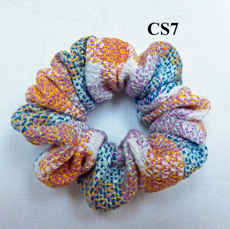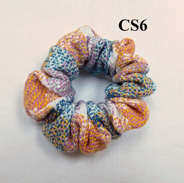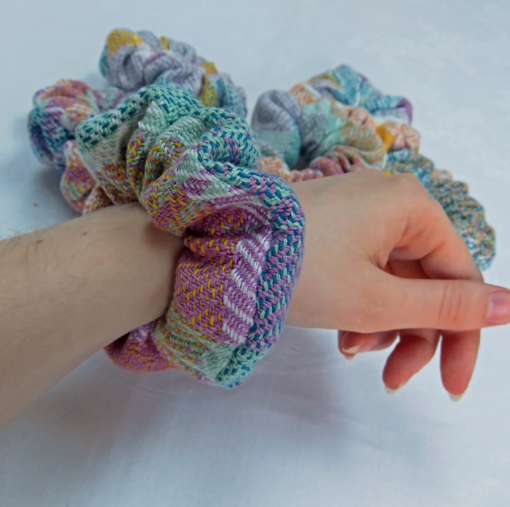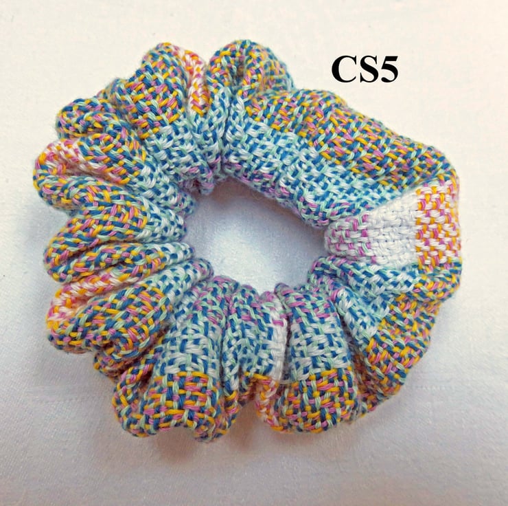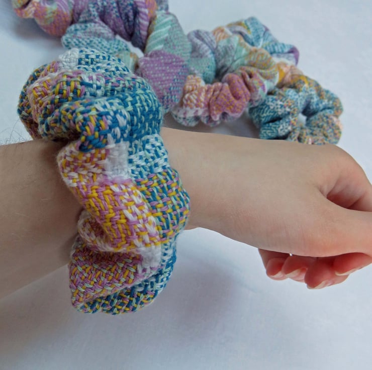 All the scrunchies are made from handwoven fabric, woven on my table loom and then sewn together on a sewing machine, an elastic band inserted and then finished by hand.