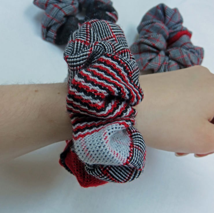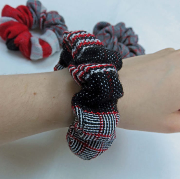 Made with handwoven merino wool fabric, each of these scrunchies is unique and cannot be made again. Predominantly woven in black and white with some red, and in a mix of stripes of colour and a log cabin pattern.