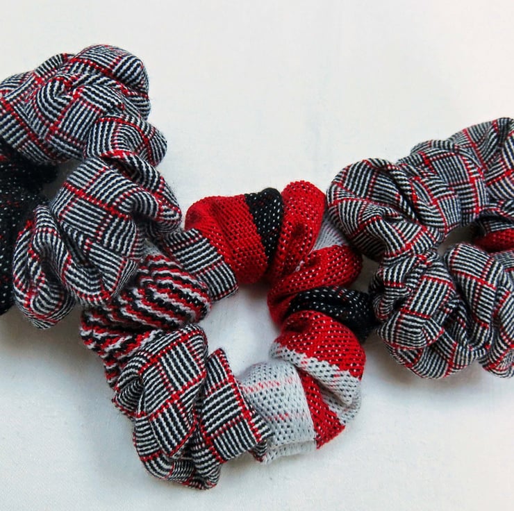 All the scrunchies are made from handwoven fabric, woven on my table loom and then sewn together on a sewing machine, an elastic band inserted and then finished by hand.