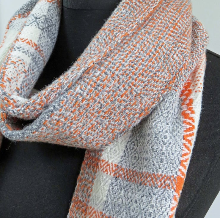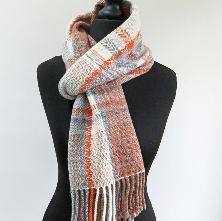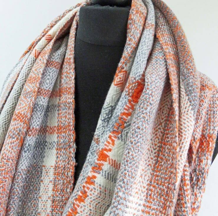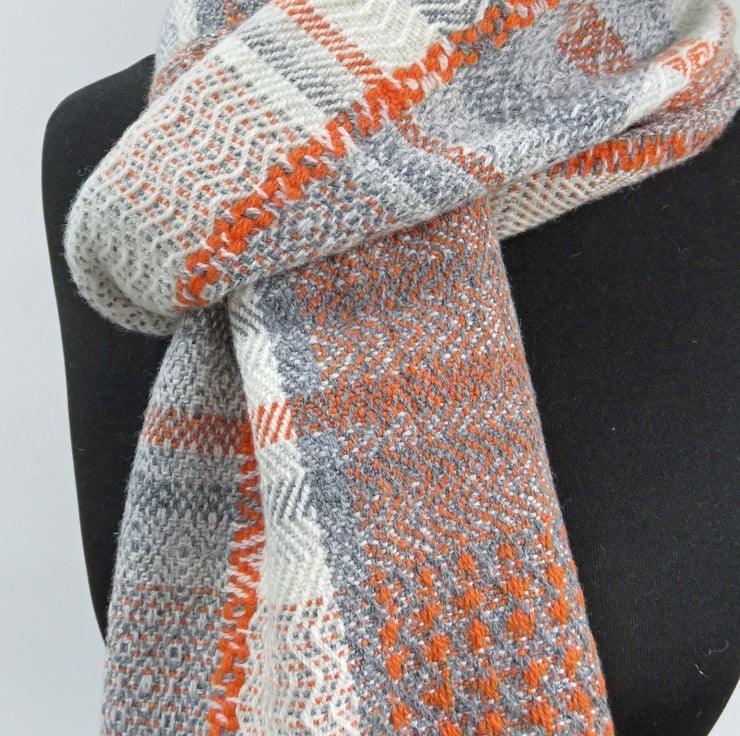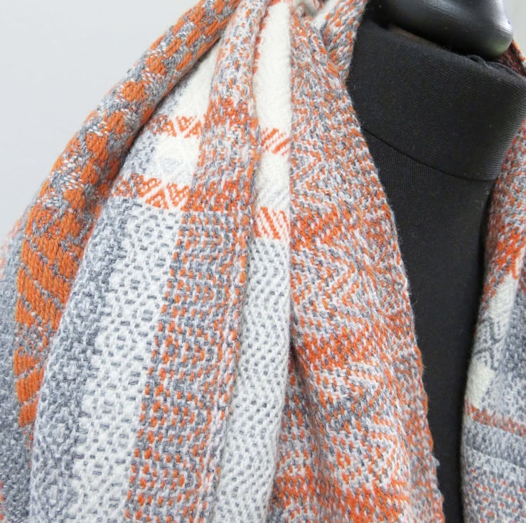The patterns on the scarf are mainly twill patterns, making zig-zags and diamonds. There is also an orange extra warp, which adds more detail and patterns - this can be seen in the pictures.