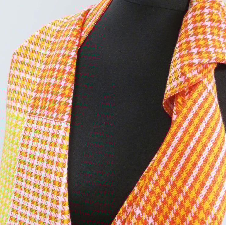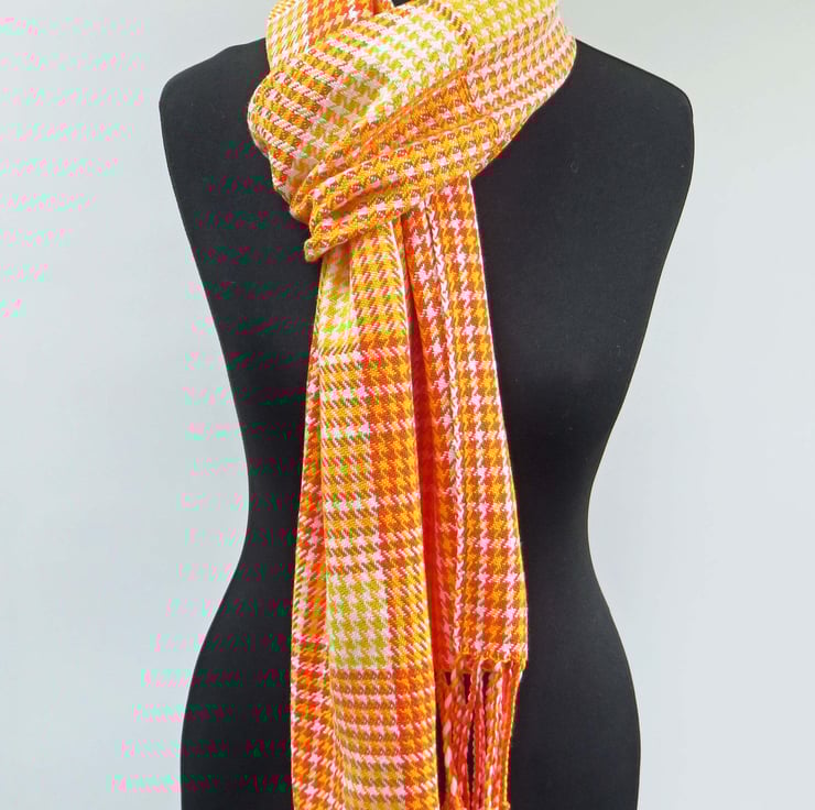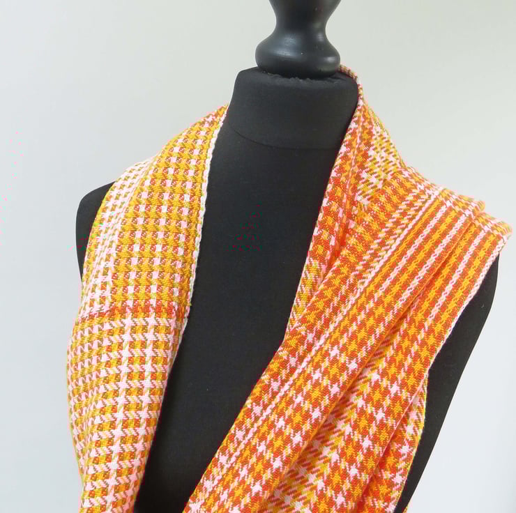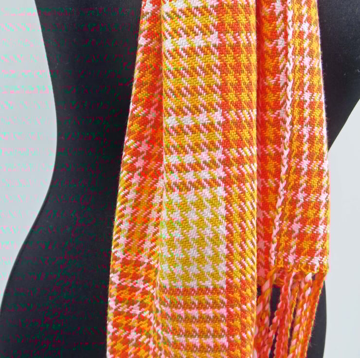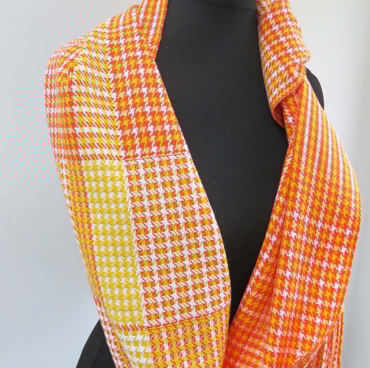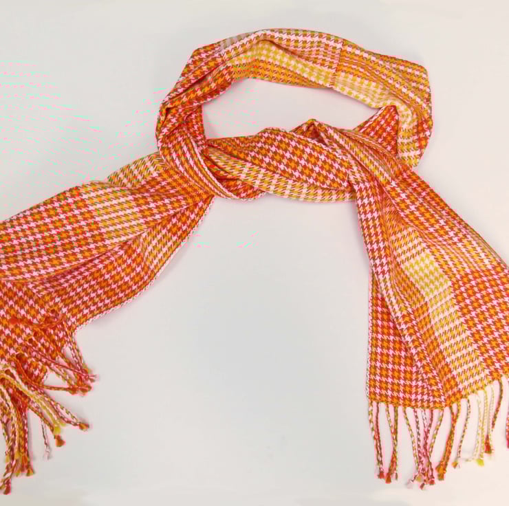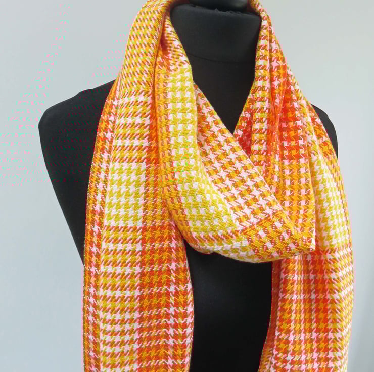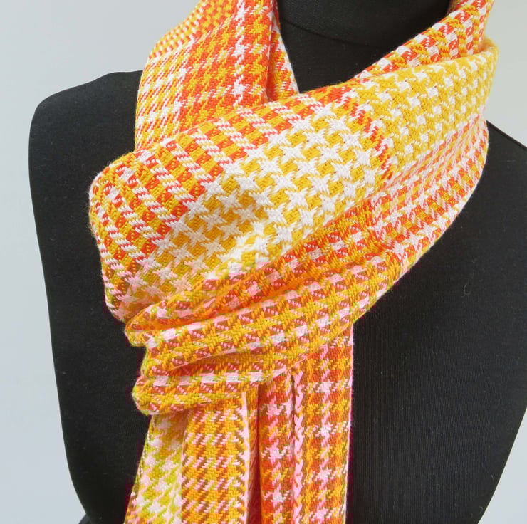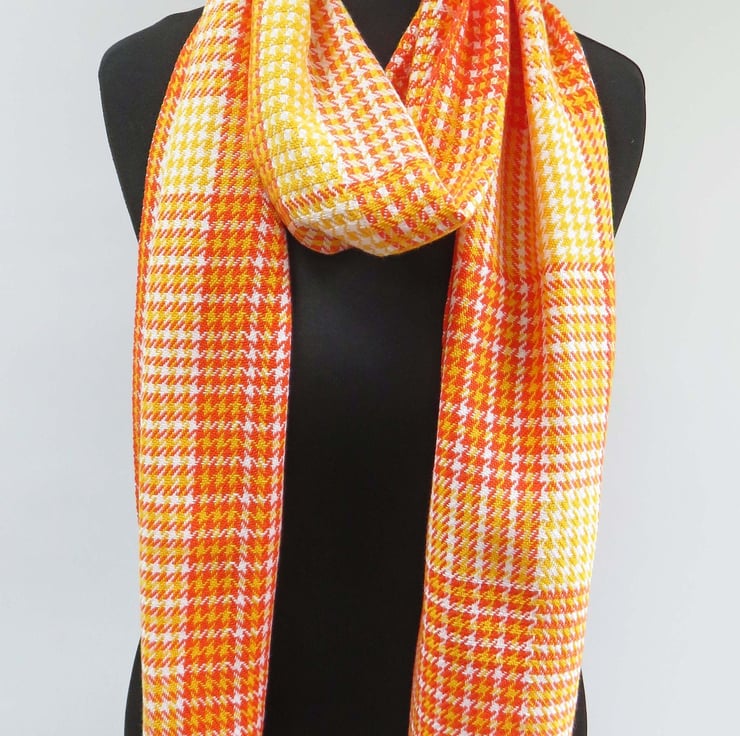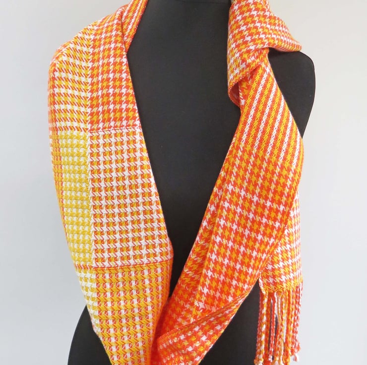A lightweight handwoven cotton scarf in orange, white and yellow; the pattern is a take on a houndstooth, which does run through the whole scarf, and small sections of what I refer to as 'stars', which can be seen in some of the pictures.