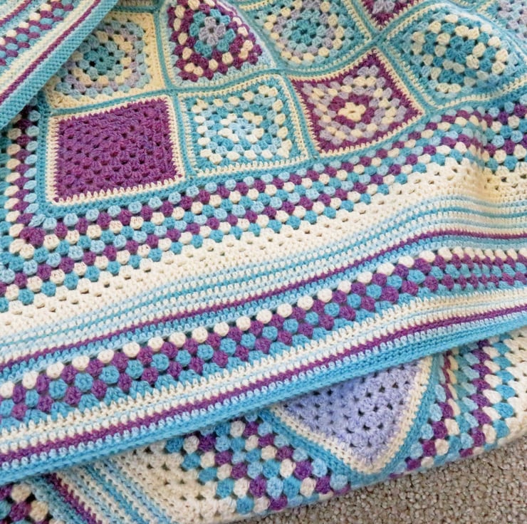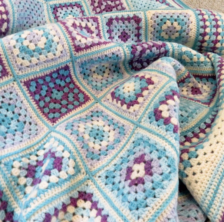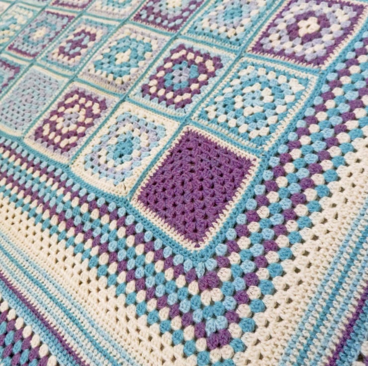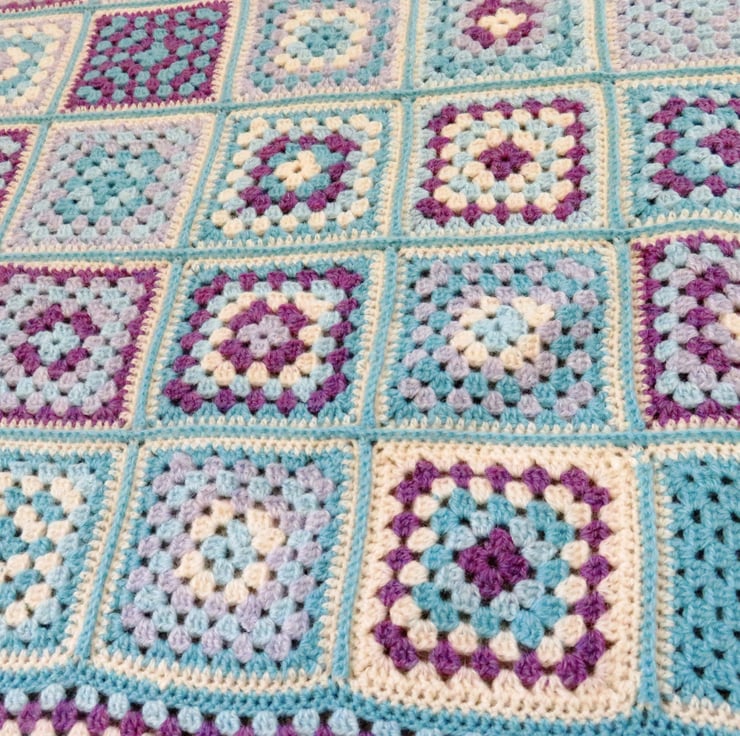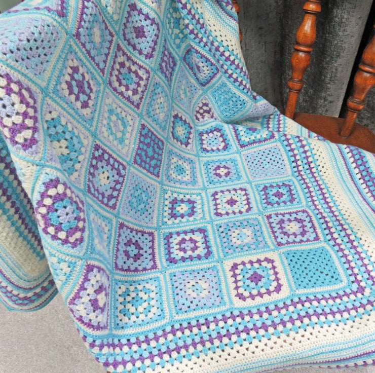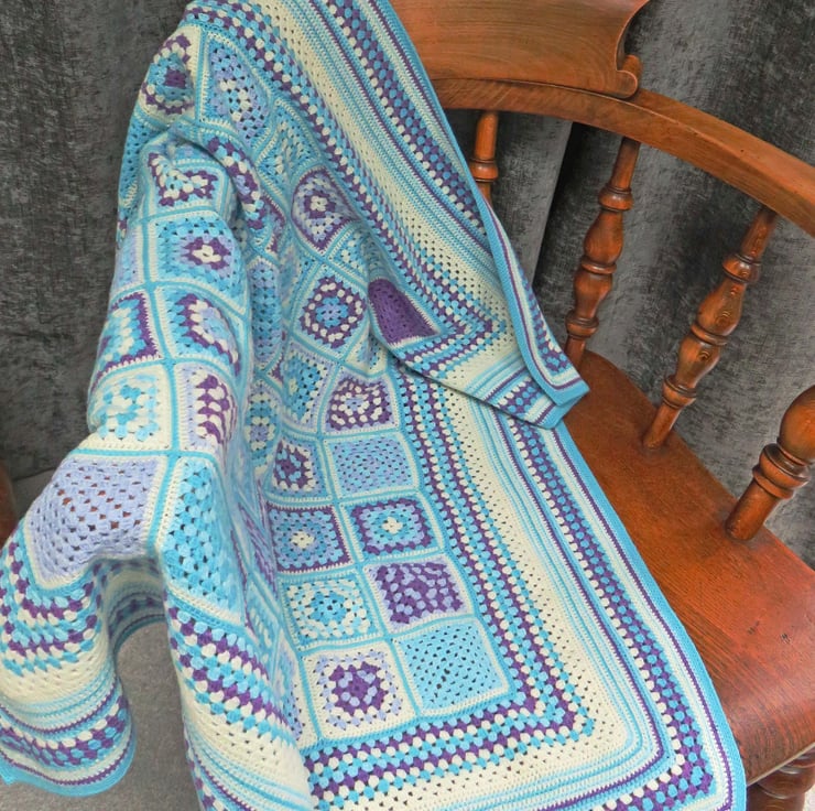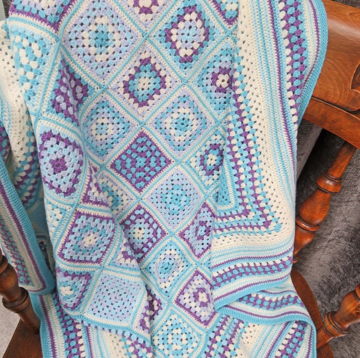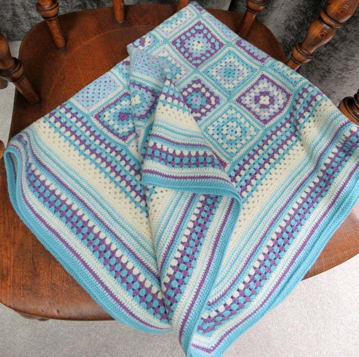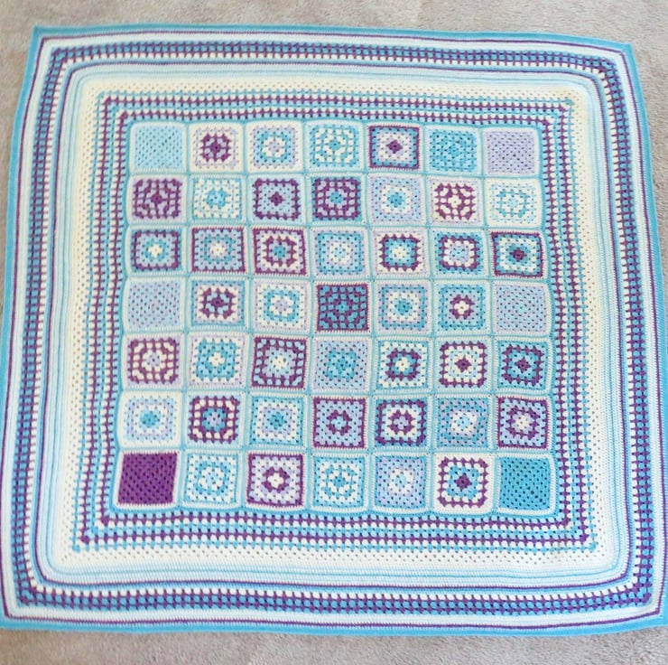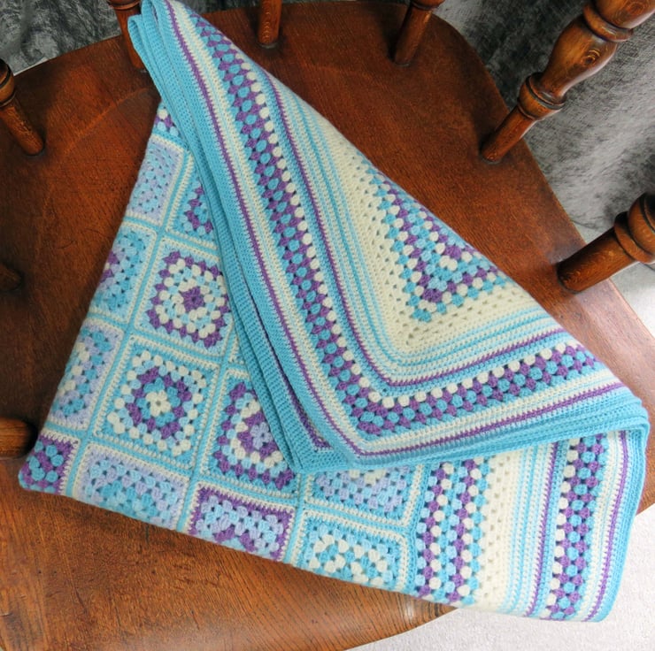 A central pattern of granny squares in a mix of white, blues and purples, all joined together and then the colours used around the edge to extend the fabric. I like to think this blanket is gender neutral in the use of colour and therefore would be a suitable in any home.